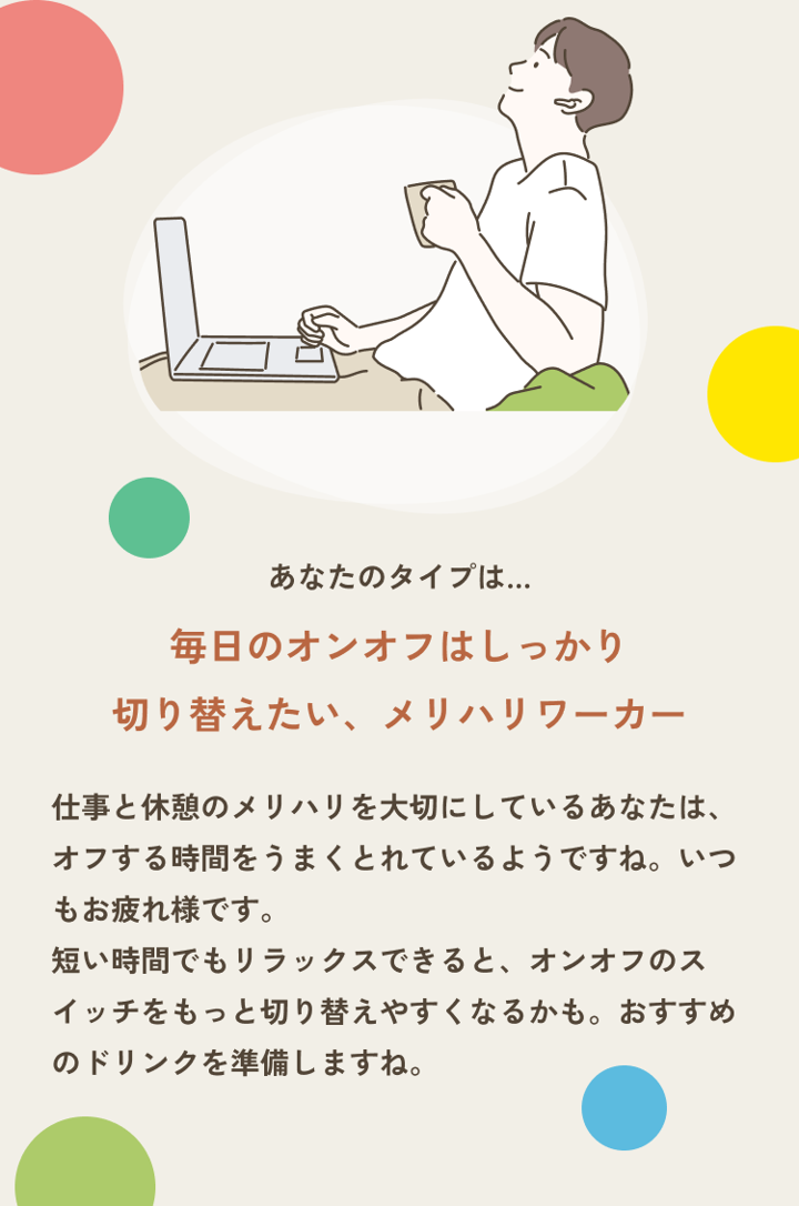 「気持ちの動き」と「休憩の関係」を定期レポートで見える化します。記録を重ねていただくことで、フィードバックの内容が反映され、もっとあなた好みのドリンクセットにパーソナライズされていき、働いている時の気持ちのリズムを振り返ることができます。