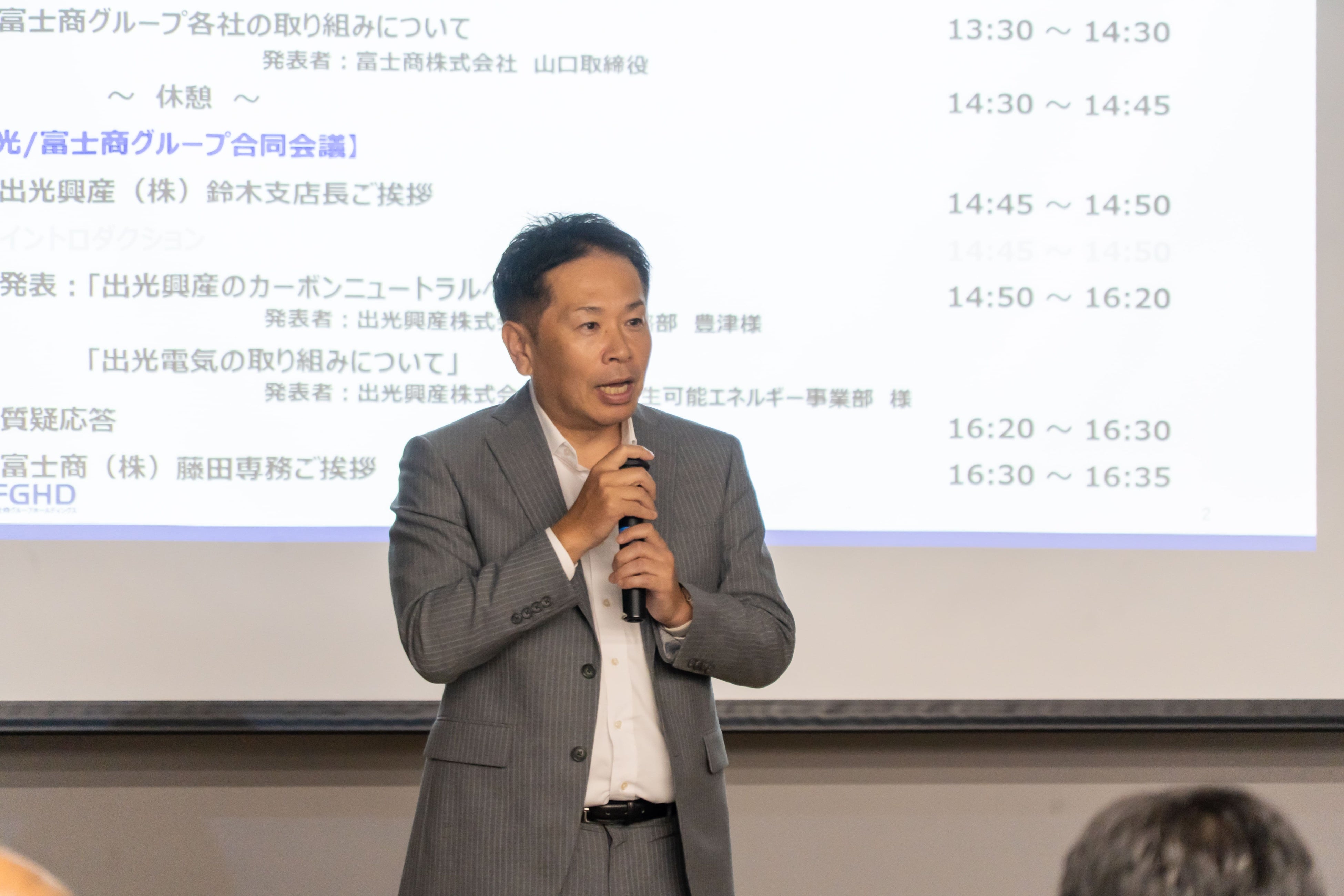 講演では、富士商株式会社が「やまぐち再エネ電力利用事業所」として認定され、これまで培ってきた電気設備の保安点検、省エネ提案、環境商材の取り扱いといった強みと、出光興産株式会社の再エネ・低炭素ソリューションを組み合わせることで、より包括的なカーボンニュートラル支援が可能になることも示されました。