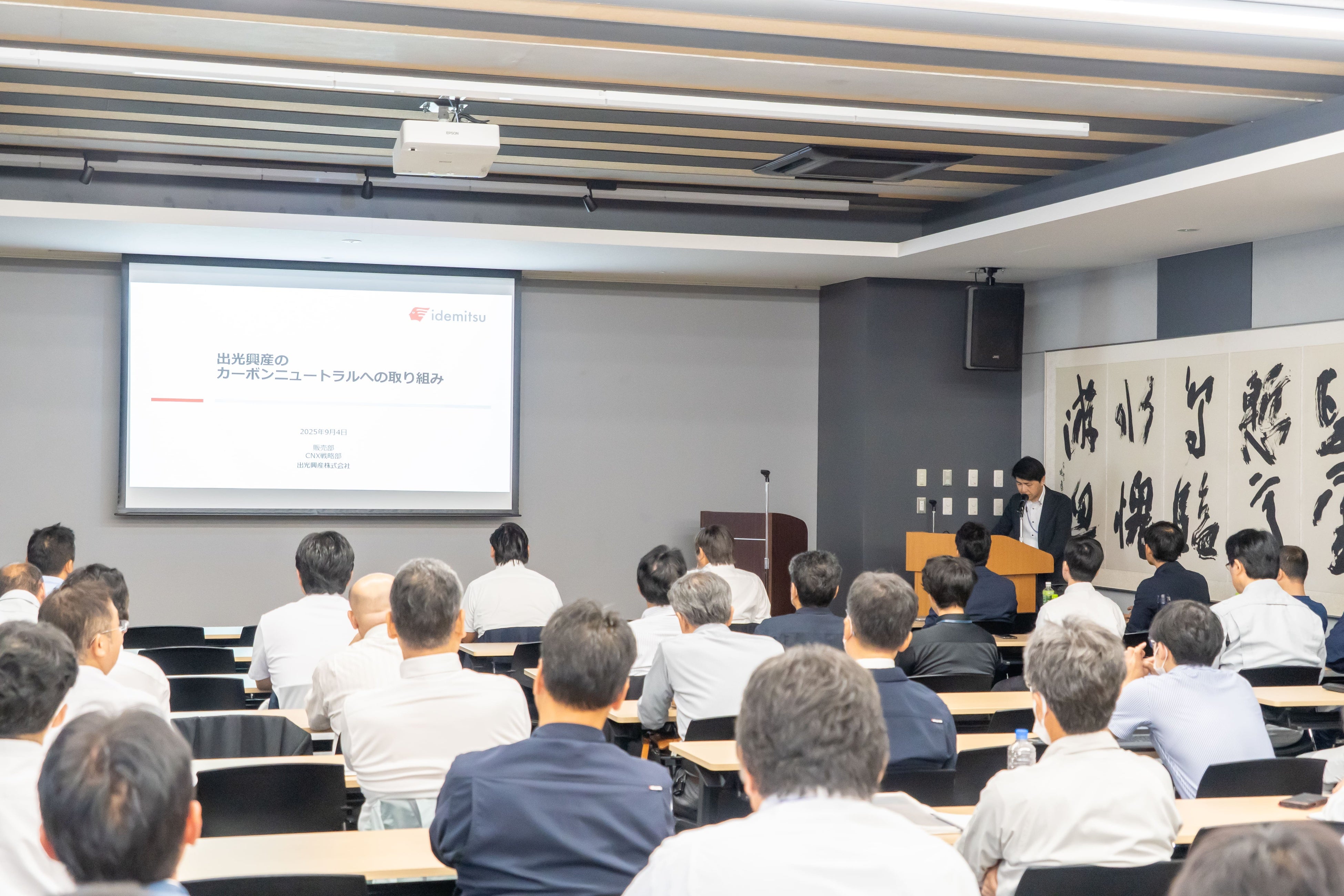 講演会では、出光興産株式会社様より、国内外の脱炭素に関する動向や制度の概要について解説が行われました。