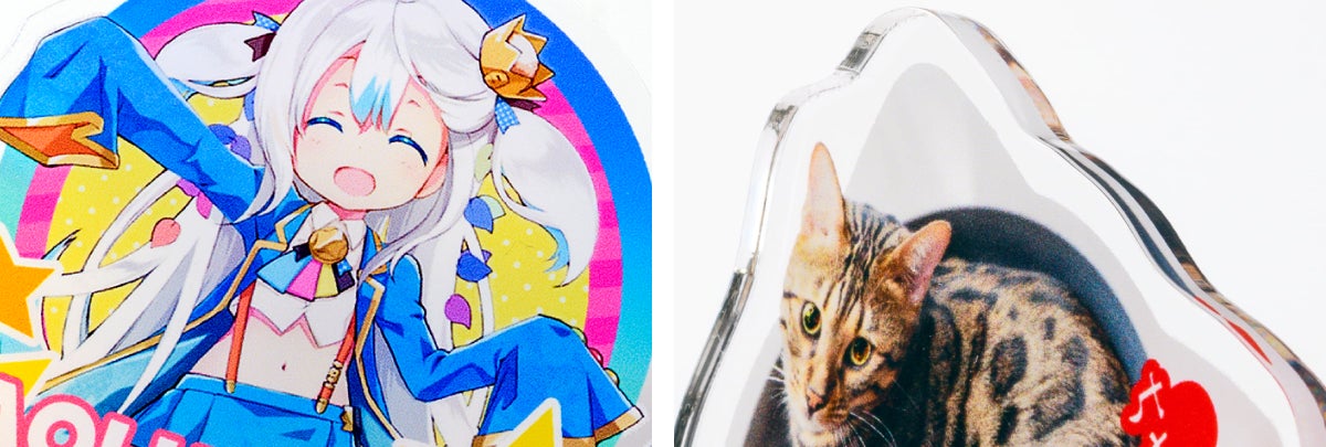 アクリルキーホルダーと台座付きアクリルフィギュアは、どちらも3mm厚の透明アクリルに、7色(CMYKLcLmLk)+ホワイトの高品質UV印刷で高発色を実現し、また両面印刷にも対応。アクリルの切り口は「アイスメルトカット方式」により断面が滑らかな仕上がりです。