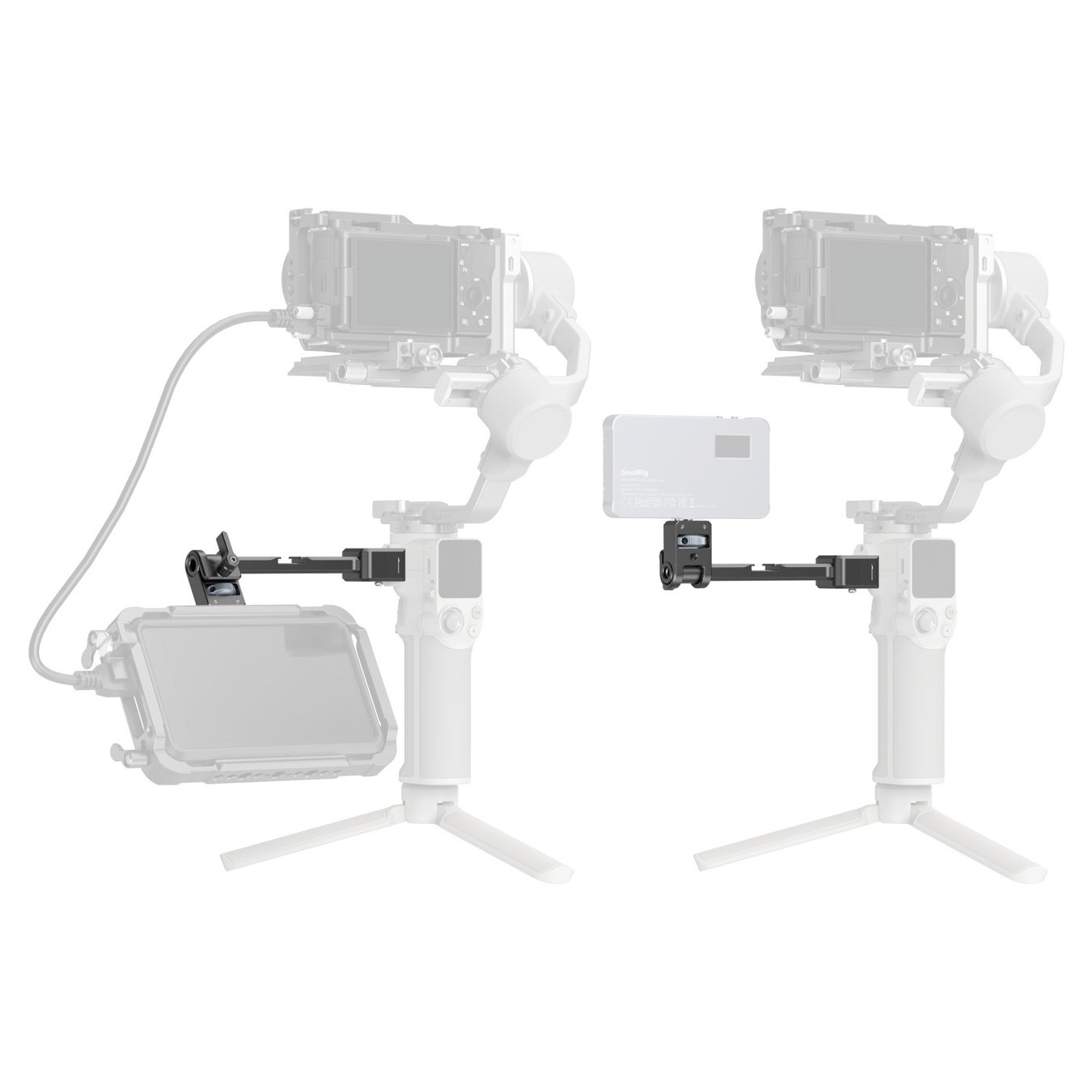 DJI RSシリーズ用モニターマウント5337は、スタビライザーの側面にモニターなどのアクセサリーを取り付けるために設計されています。NATOレールを備えたDJI RSシリーズスタビライザー(DJI RS 4 Mini / RS 3 Pro / RS 3 / RS 2 / RS C 2)に対応し、最大1.5kgの耐荷重を持ち、約5インチのモニターに適しています。モニターは無段階で上下360°回転が可能です。さらに、6つの1/4インチ-20ネジ穴と1つのコールドシューマウントを備えており、マイク、マジックアームやその他のアクセサリーを取り付けることができます。