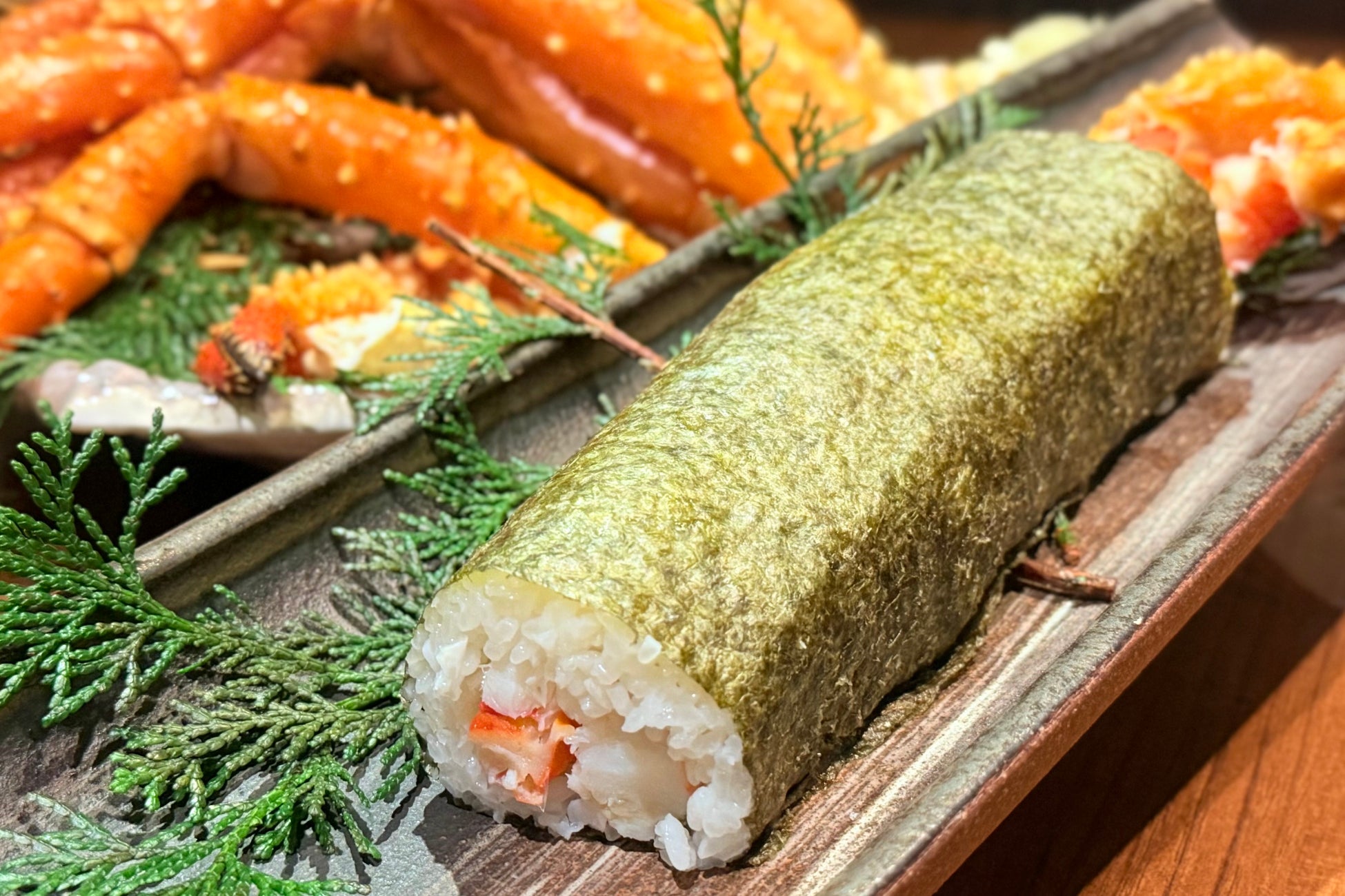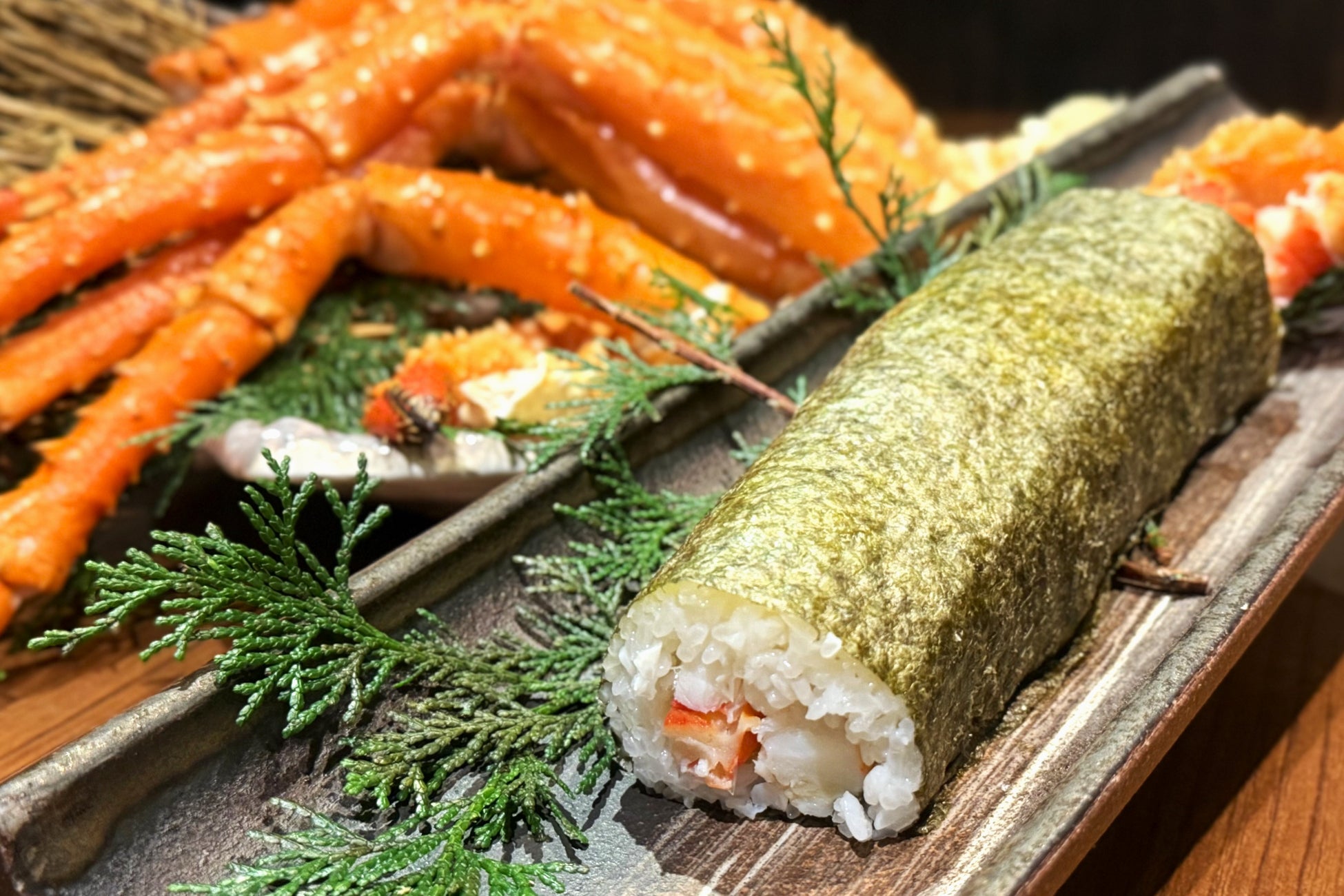 今年の節分には、贅沢で特別な恵方巻をご用意しました。他の具材を一切使用せず、イバラガニの脚のみを3本も詰め込み、蟹本来の旨味と食感を存分に味わえるよう仕上げております。両脚を伸ばすと全長約1メートルにもなるイバラガニなので、巻き寿司からはみ出した蟹脚は迫力満点で見た目のインパクトも楽しめます。