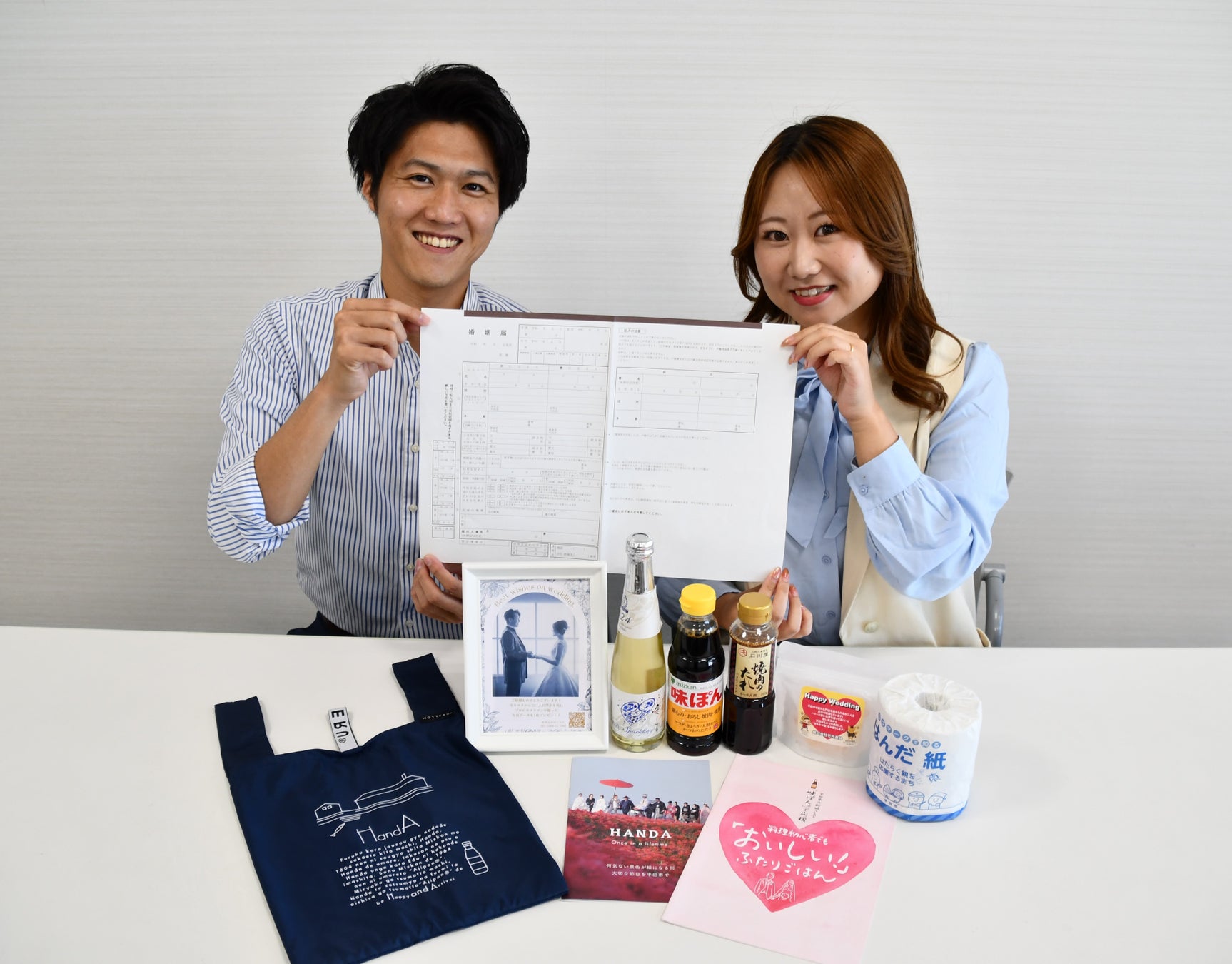 半田市では婚姻届提出者にお祝い品を提供してきましたが、これまで本籍地以外の市区町村に戸籍の届出(婚姻届、離婚届等)を行う際に必要だった戸籍謄本が3月の法改正により原則不要になり、日本全国どこでも手間なく提出できるようになったことを受け、お祝い品をよりパワーアップしました。令和6年10月からは県内最多提供数となる合計7品をお祝い品としてお渡ししています。お祝い品はすべて、市内の事業者からの寄贈により集まりました。