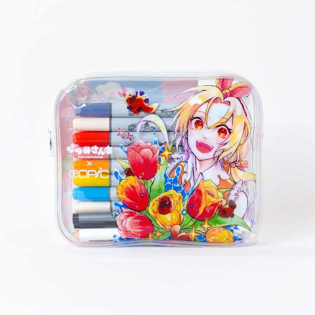 また、鮮やかな描き下ろしイラストが目をひく両面デザインのオリジナルポーチもファン必見の特製アイテムです。しっかりとした厚手のポーチでマチつきのため、コピックチャオなどのコピック製品もたっぷり収納できます。