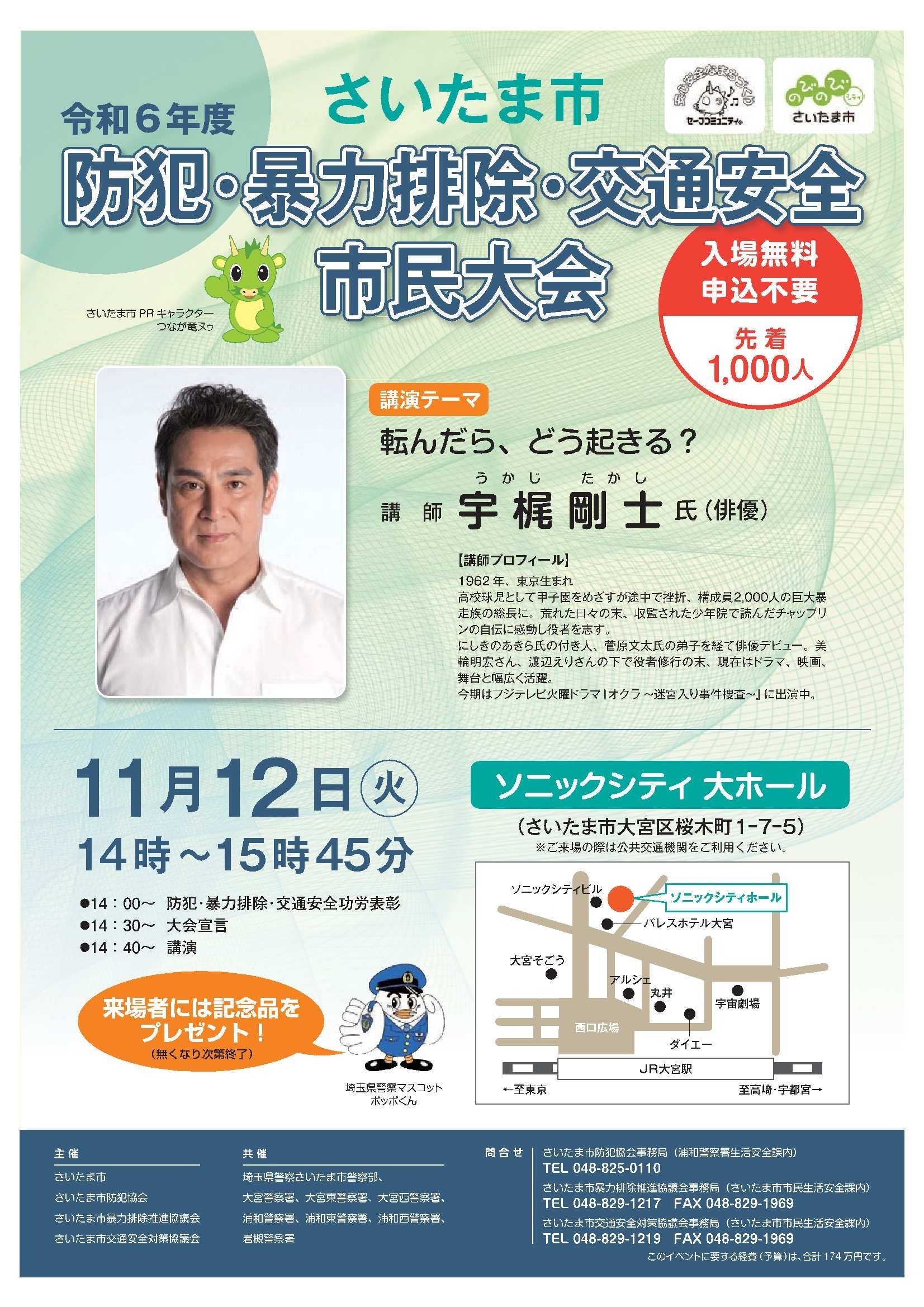防犯・暴力排除・交通安全に対する市民意識の高揚を図り、安心して暮らせる安全なまちづくりを推進するため、「令和6年度さいたま市防犯・暴力排除・交通安全市民大会」を開催します。