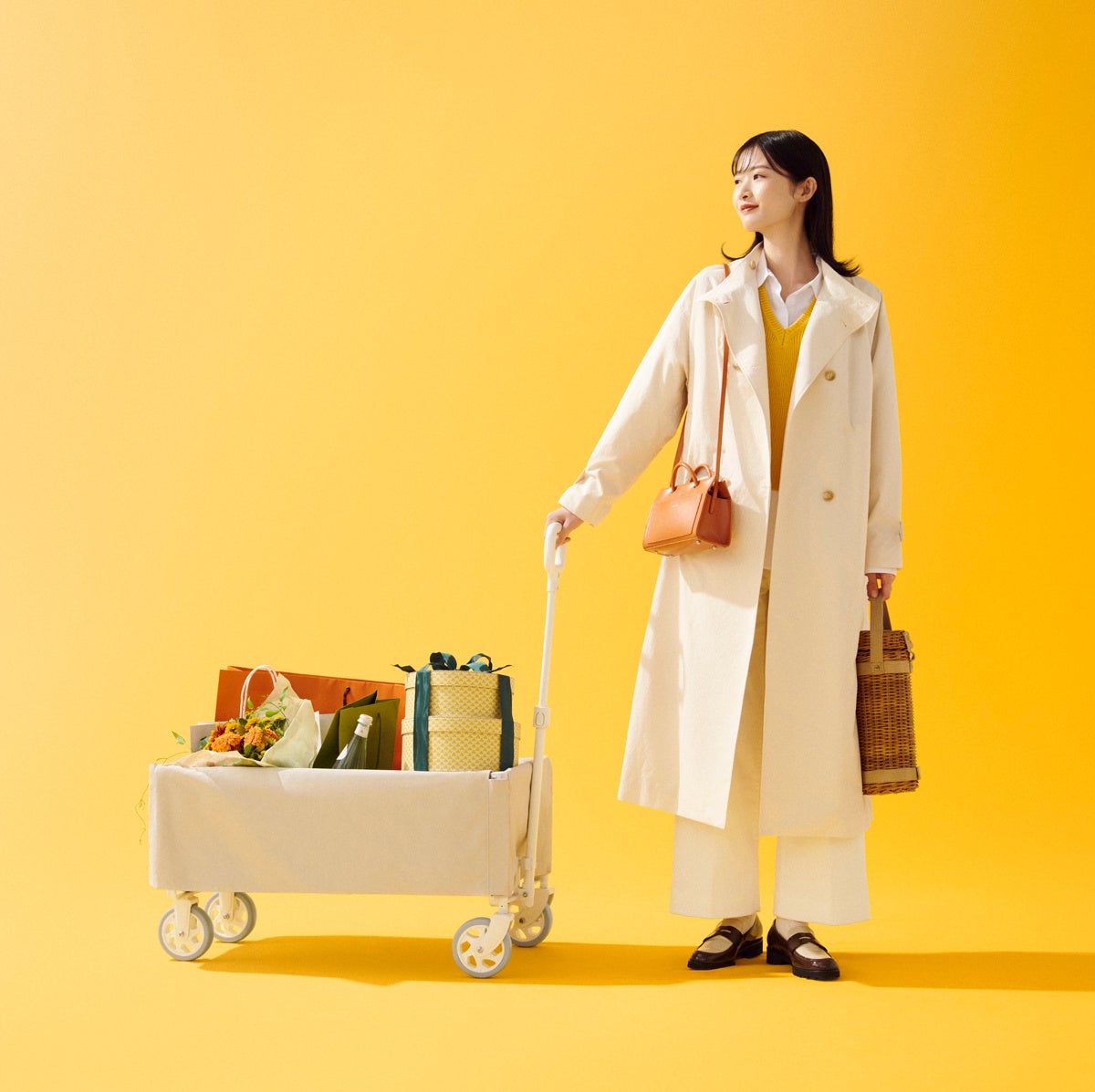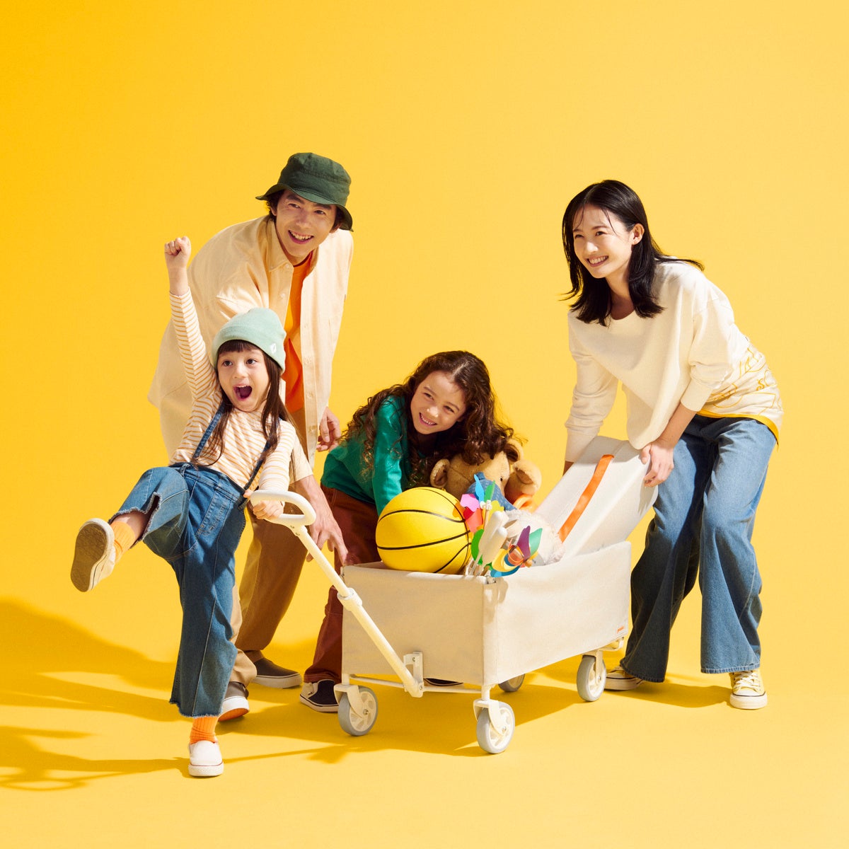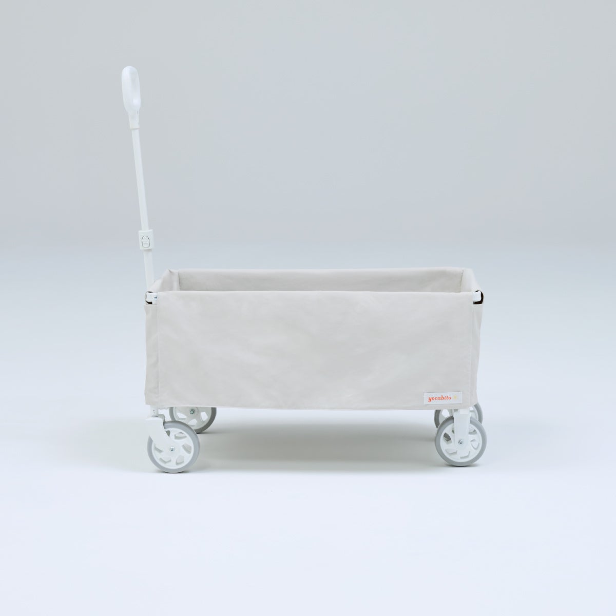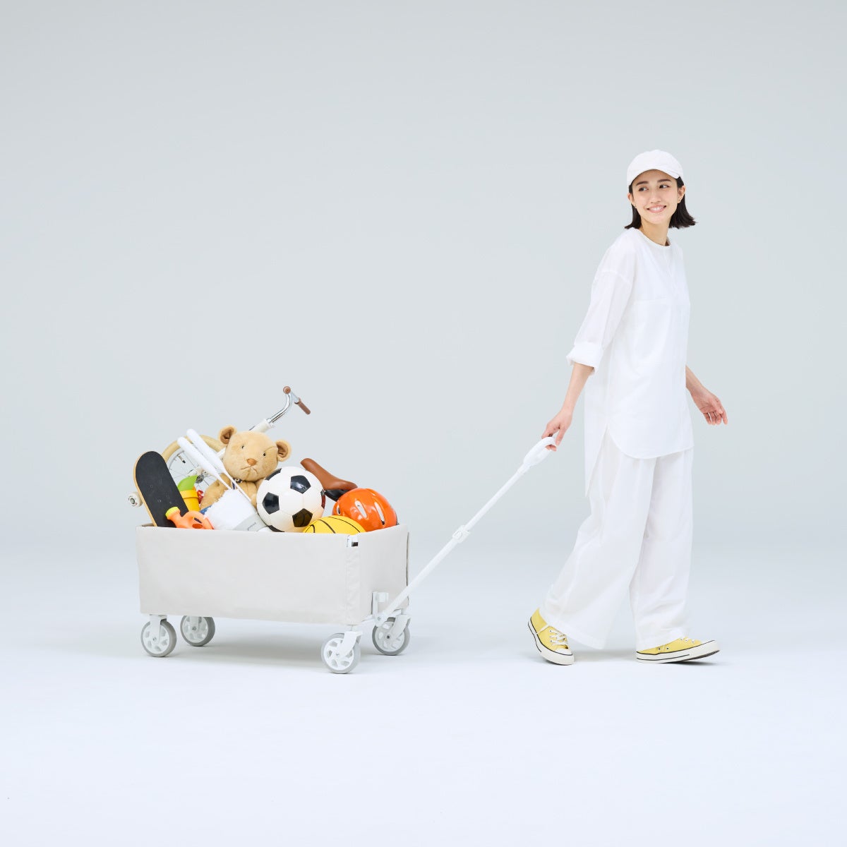 一般的なキャリーワゴンに見られる骨組みを、生地の内側に隠すことで、シンプルで美しい箱型の「スクエアフォルム」を実現しました。無骨なギア感を排除したデザインは、街中での買い物や公園への移動でも違和感なく、日常のあらゆるシーンにファッションのように馴染みます。