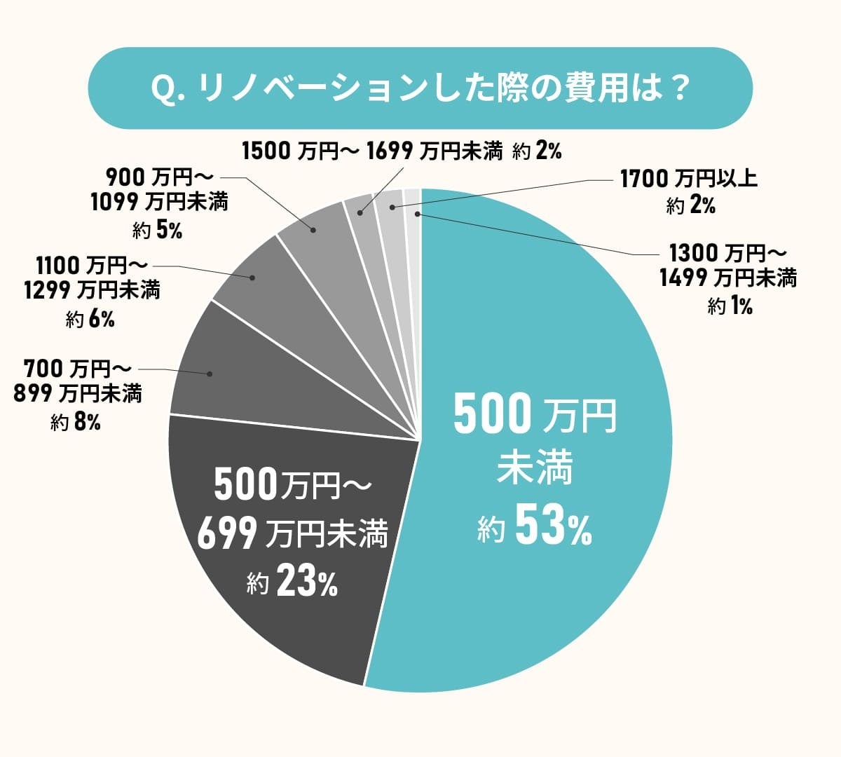 最も多かったのは「500万円未満」の約53%で、半数以上を占めました。次いで「500万円〜699万円」が約23%と、ボリュームゾーンは「500万円未満~699万円」の部分的なリノベーションです。