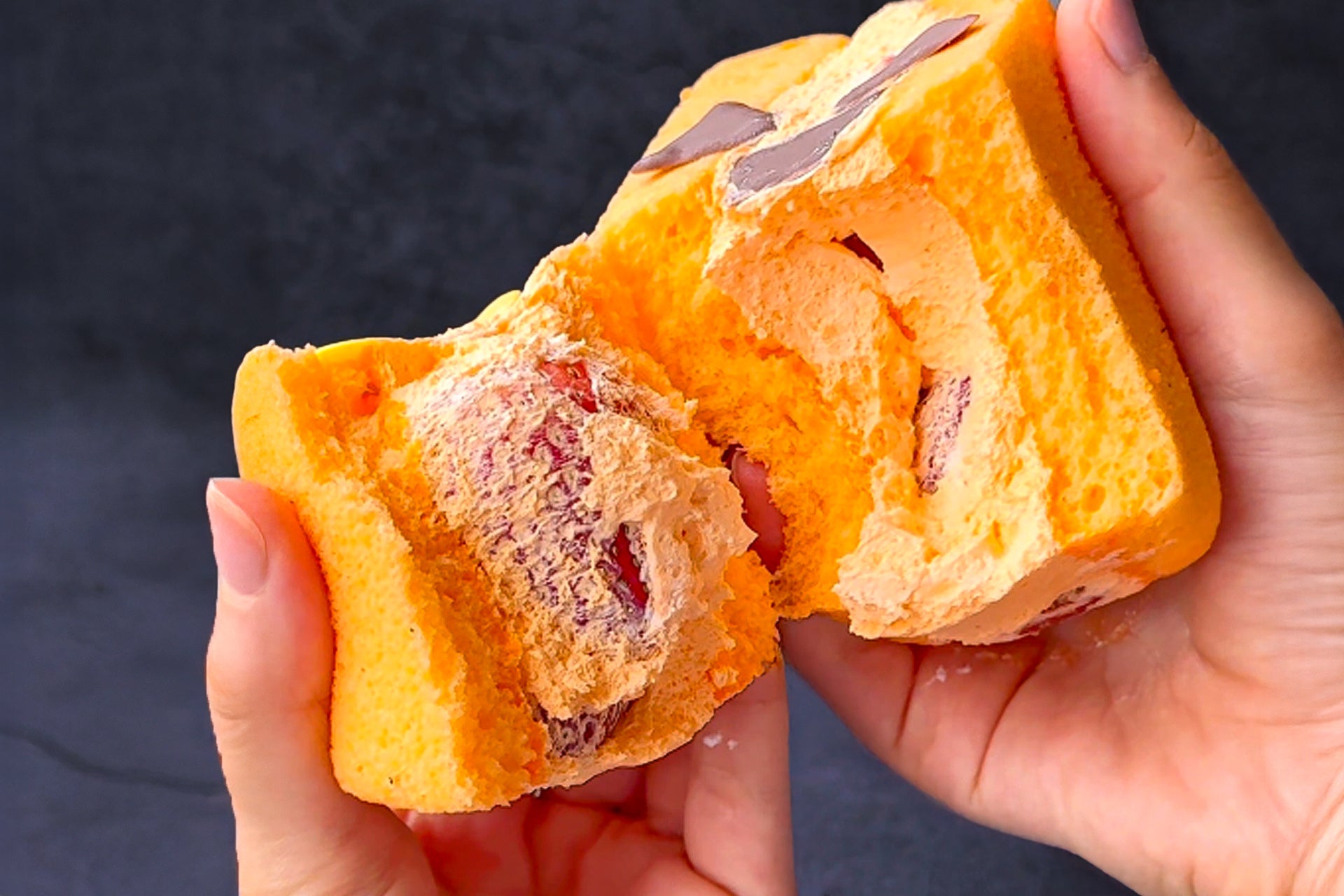 シフォンとクリームはオレンジ色でも、味わいはプレーンのシフォンとミルキーなクリーム。まるでショートケーキをそのままサンドしたかのような、間違いなしの美味しさ…いや、それ以上!