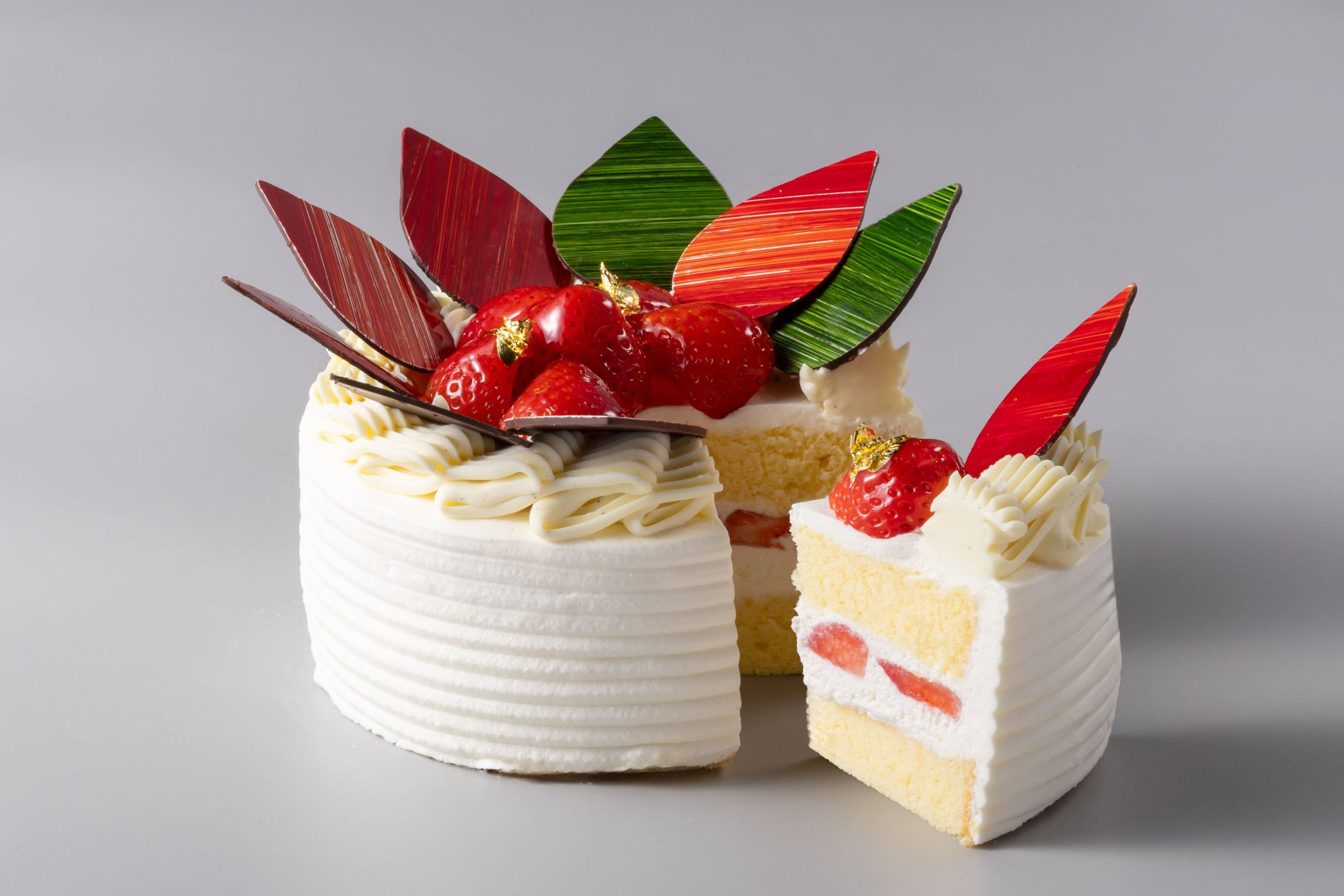 苺と北海道産生クリームを贅沢に使用し、ホワイトチョコクリームにマダガスカル産バニラビーンズを加えた華やかなケーキ。ポインセチアをイメージしたチョコレートで聖夜を演出します。