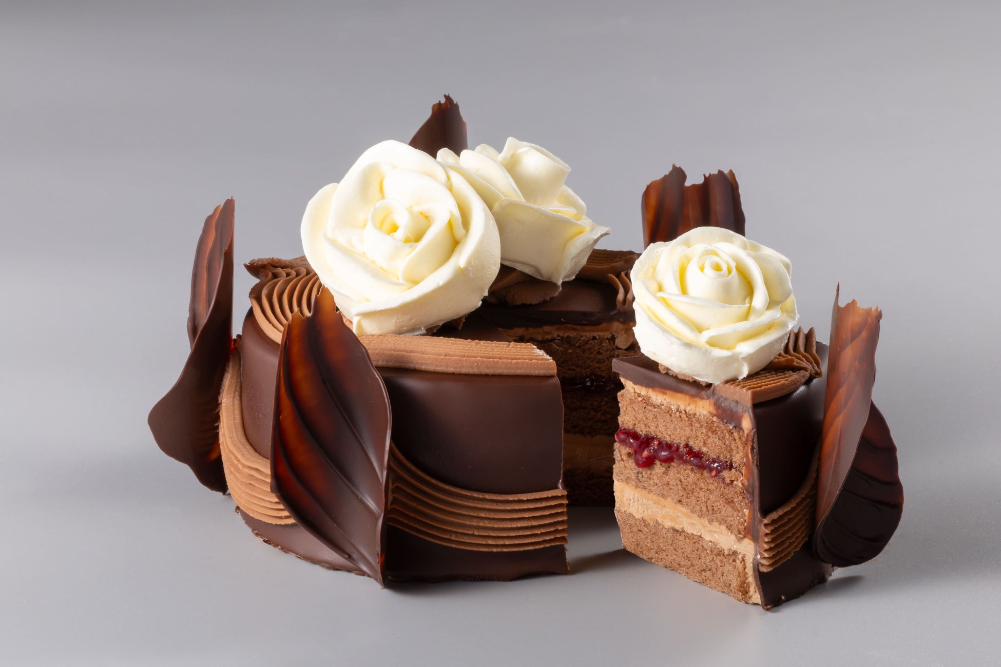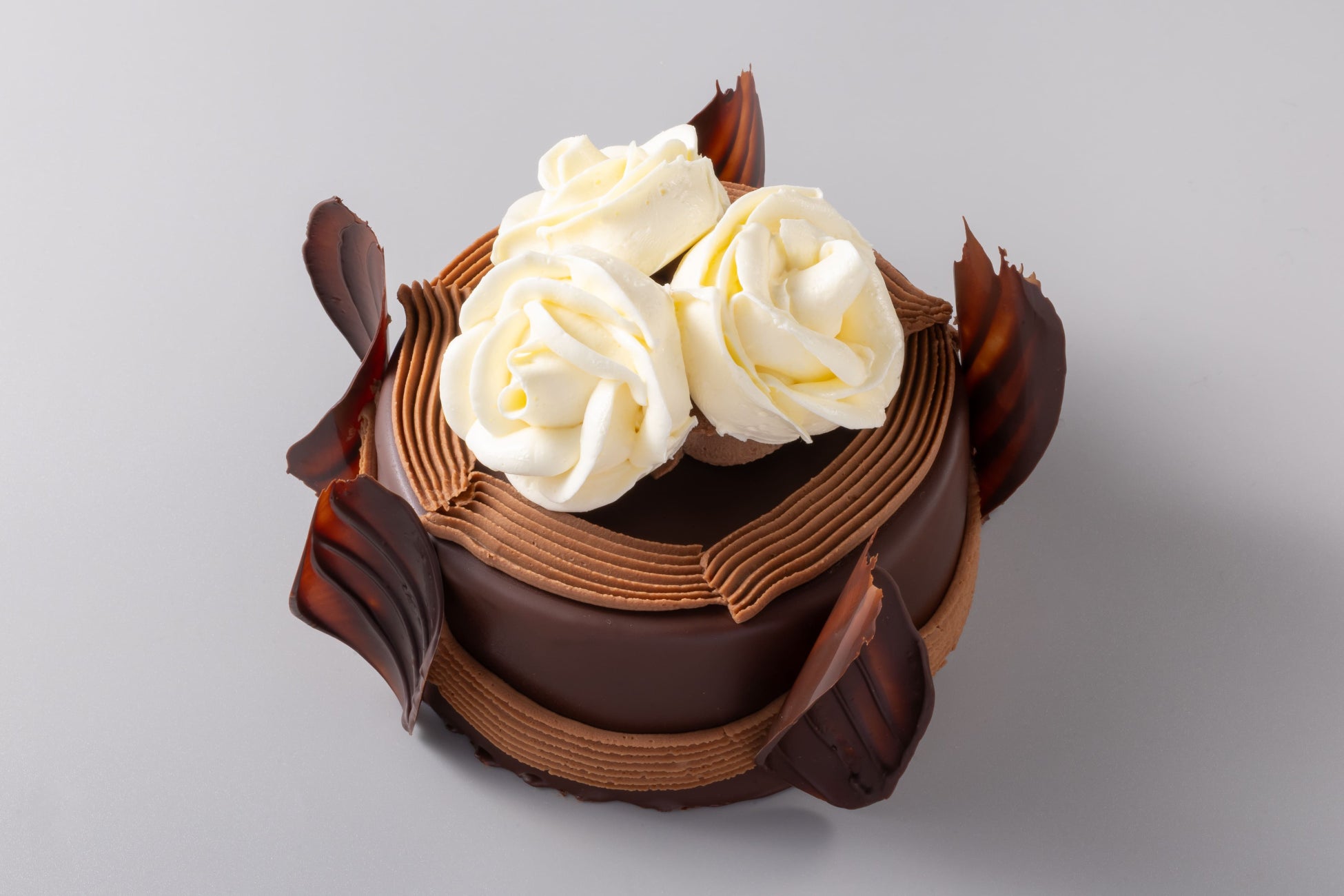 昔懐かしいチョコレートバタークリームケーキを、北海道産バターで軽やかに仕上げました。トップに咲くバタークリームの薔薇は職人技の証。