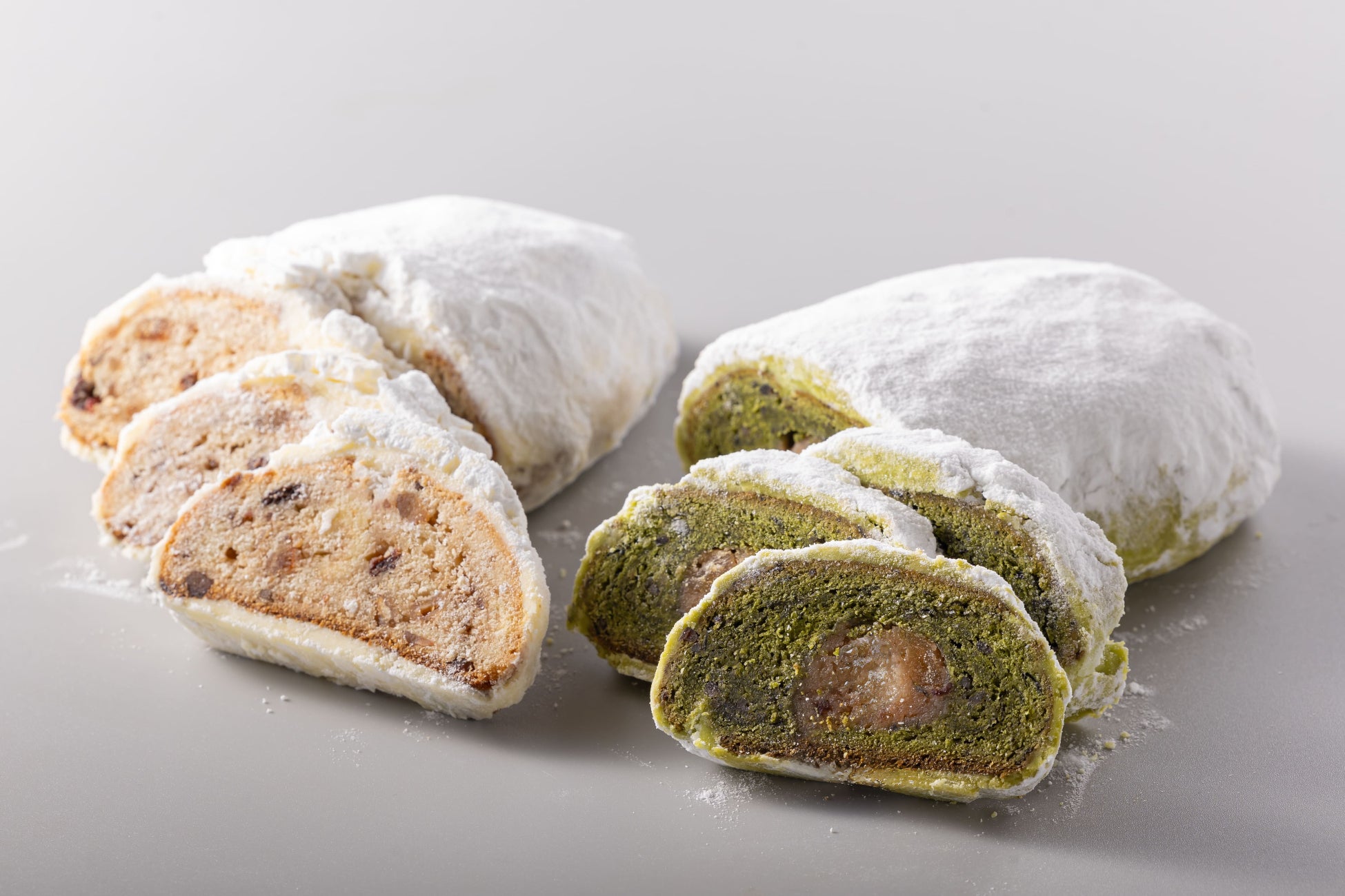 宇治抹茶の香り豊かな生地に丹波黒大豆を練り込み、栗風味のマジパンを巻き込んだ「和」のシュトーレン。一本で二層の味わいを楽しめます。