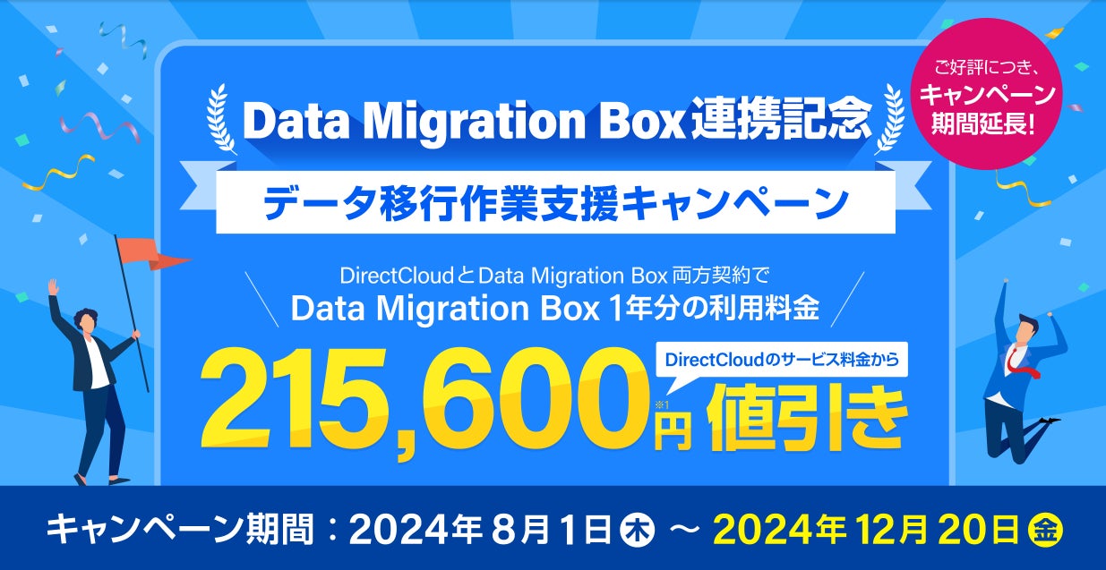 クラウドストレージで更なるドキュメント活用を推進する株式会社ダイレクトクラウド(本社:東京都港区、代表取締役:安 貞善、以下ダイレクトクラウド)は、「DirectCloud×Data Migration Box導入キャンペーン」を好評につき2024年12月20日(金)まで期間を延長いたします。本キャンペーンは株式会社ジャングル(本社:東京都千代⽥区、代表取締役 兼 CEO:⾼⽥ 晃⼦、以下「ジャングル社」)が提供するデータ移行ツール「Data Migration Box」と連携し、Data Migration Box の1年分の利用料金(税別)をDirectCloud の利用料金からお値引きするキャンペーンです。