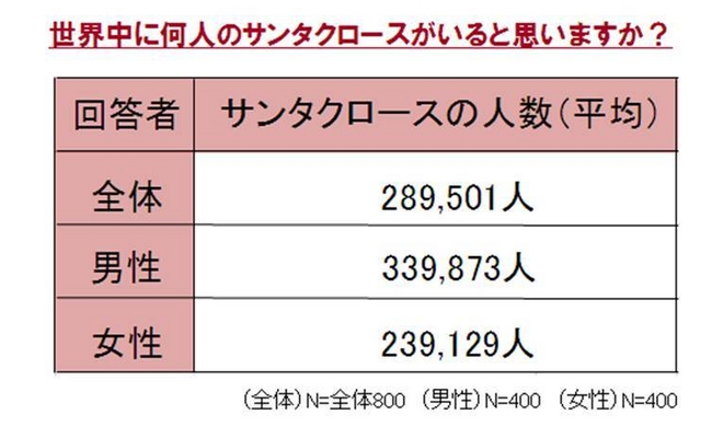 また、世界中には何人のサンタクロースがいると思うかをたずねたところ、全体(男女800人)の回答の平均では、サンタクロースは世界中に「289,501人」いるという結果になりました。ちなみに男女別でみると、意外にも男性が思うサンタクロースの人数の方が多く、男性回答の平均では「339,873人」、女性回答の平均では「239,129人」のサンタクロースがいるという結果になりました。今年のクリスマス、日本には、ひとりでも多くのサンタクロースに来てほしいものです。