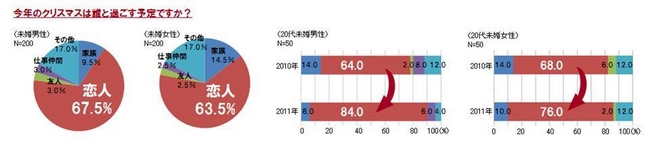 2011年は、家族や大切な人との「絆」を改めて感じた人も多いのではないでしょうか。「キズナ婚」という言葉がうまれたように、恋人から家族へと変化を望む未婚男女も多くいるようです。実際の調査でも、今年のクリスマスは誰と過ごすかを聞いたところ、未婚男女で「恋人と過ごす」と回答した人は、男性67.5%(昨年比+12p)、女性63.5%(昨年比+9p)と、昨年から大幅にアップしました。特に20代男性の上昇幅が大きく、20代女性が昨年比+8pの76.0%という結果に対して、20代男性は昨年比+20pの84.0%と、男女間、世代間の意識の変化の差が顕著に現れました。