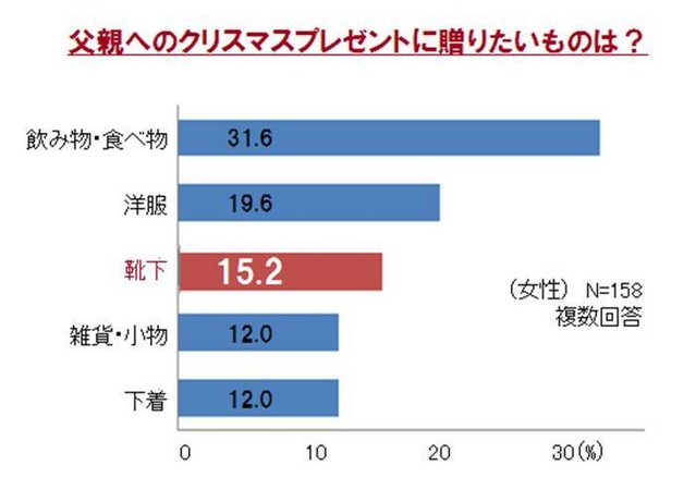クリスマスプレゼントといえば、親から子供、恋人同士で贈ることが一般的ですが、「家族の絆」を再確認するためにも、今年は、日ごろなかなか感謝の気持ちを口に出して言えない両親へ、クリスマスプレゼントを贈ってみてはどうでしょうか。ちなみに、女性を対象に父親への今年のクリスマスプレゼントに贈りたいものを聞いてみたところ、「飲み物・食べ物(31.6%)」、「洋服(19.6%)」、「靴下などのレッグウェア(15.2%)」にポイントが集まりました。好みがわかりやすい飲食系や身につけられる物の人気が高いようです。比較的価格も手ごろならが、クリスマスアイテムとしてもなじみ深い「靴下」なら、初めての父親へのクリスマスプレゼントでも、照れずに渡せるかもしれませんね。