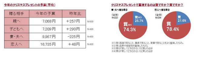 また、今年のクリスマスプレゼントで重視したいのは、「贅※1」か「質※2」かを聞いたところ、配偶者に贈る場合(贅25.7%・質74.3%)、恋人に贈る場合(贅21.6%・質78.4%)ともに、「贅」より「質」を重視する人が多数という結果になりました。