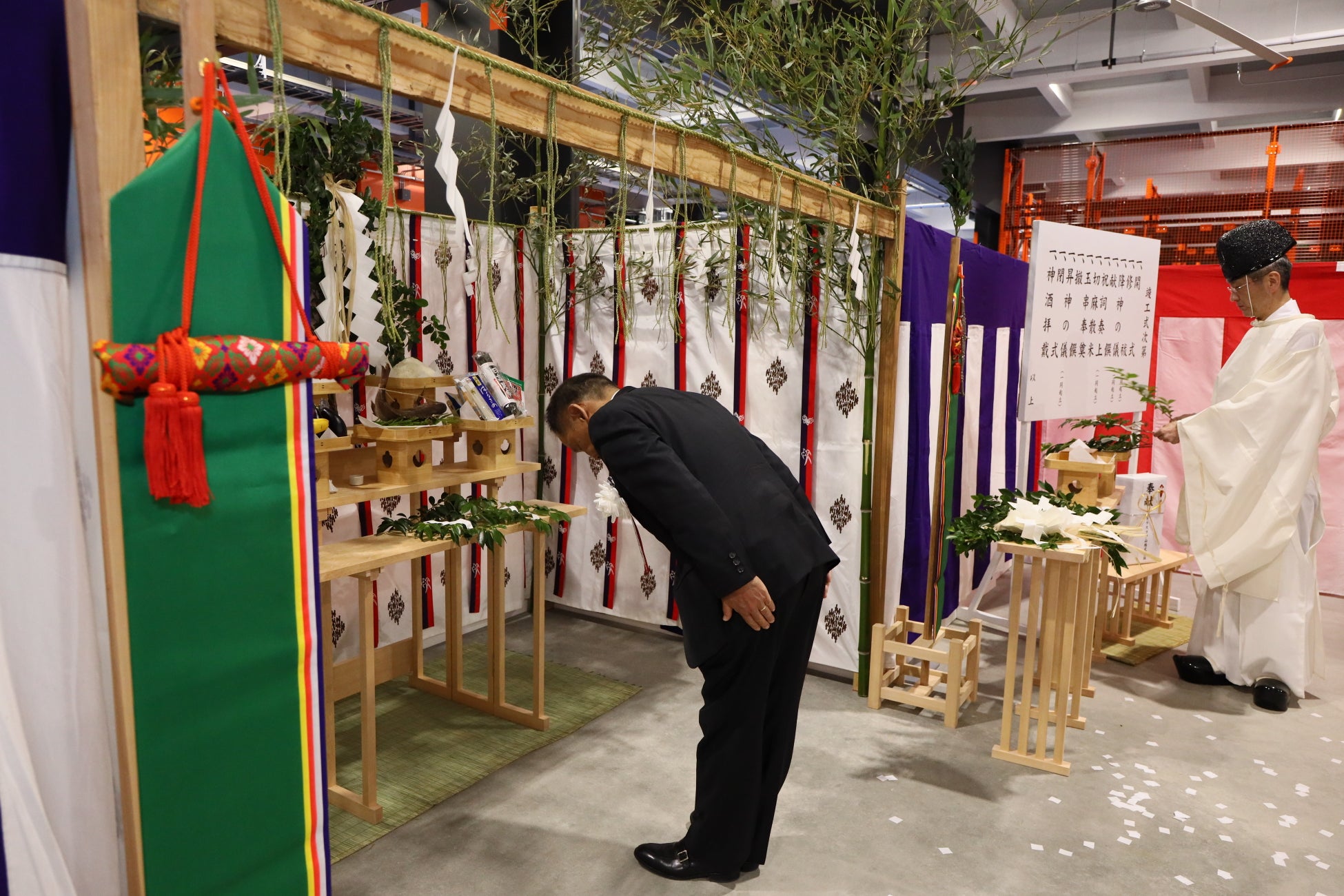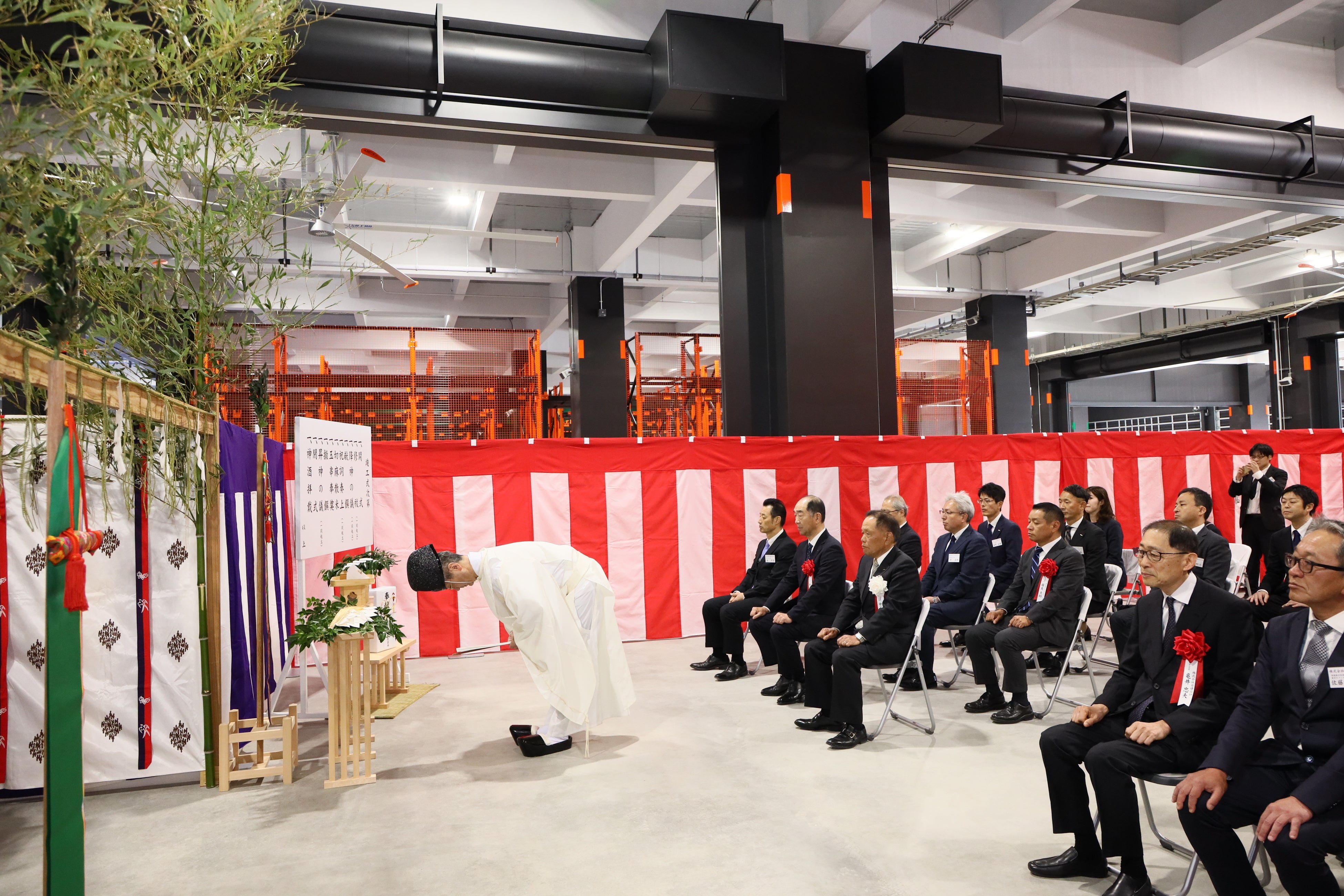 竣工式には、設計を担当いただいた株式会社日建設計の取締役会長 亀井 忠夫 様、施工を担当いただいた鹿島建設株式会社 代表取締役会長 兼 社長 押味 至一 様とともに、トラスコ中山株式会社の代表取締役社長 中山哲也が参列し、修祓や降神、玉串奉奠(ほうてん)などの儀式を滞りなく執り行いました。