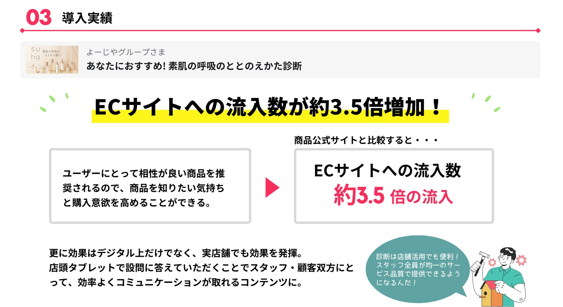 ・サービスサイト、店舗での併用活用(EC流入率約3.5倍、診断の提案商品を店舗で購入)