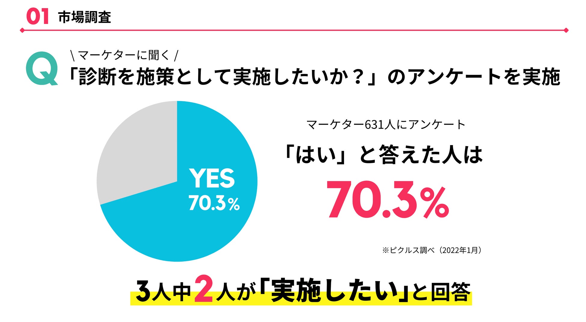 株式会社ピクルス(本社:東京都品川区、代表取締役社長:田中 稔、以下「ピクルス」)は、美容・コスメ業界における課題を、診断コンテンツによって解決した成功事例資料を公開しました。本資料は、ECサイトへの流入増加、LINE友だち獲得、オムニチャネル化といった課題別に、成功事例を詳しく解説しています。