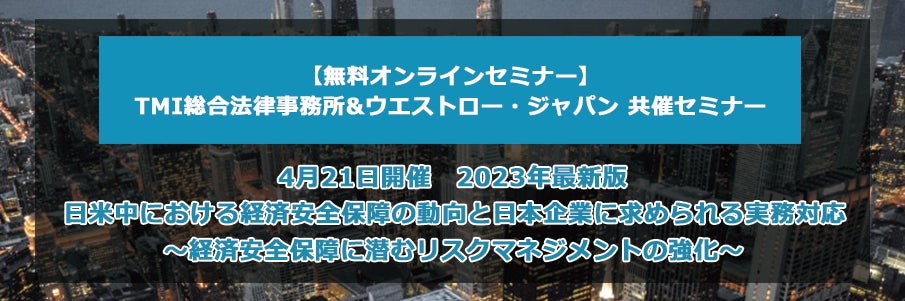 ウエストロー・ジャパン株式会社(東京都港区、代表取締役社長 ヨンソン・バン)は、2023年4月21日(金)、TMI 総合法律事務所と共催で『2023年最新版 日米中における経済安全保障の動向と日本企業に求められる実務対応~経済安全保障に潜むリスクマネジメントの強化~』と題したオンラインセミナーを開催いたします。