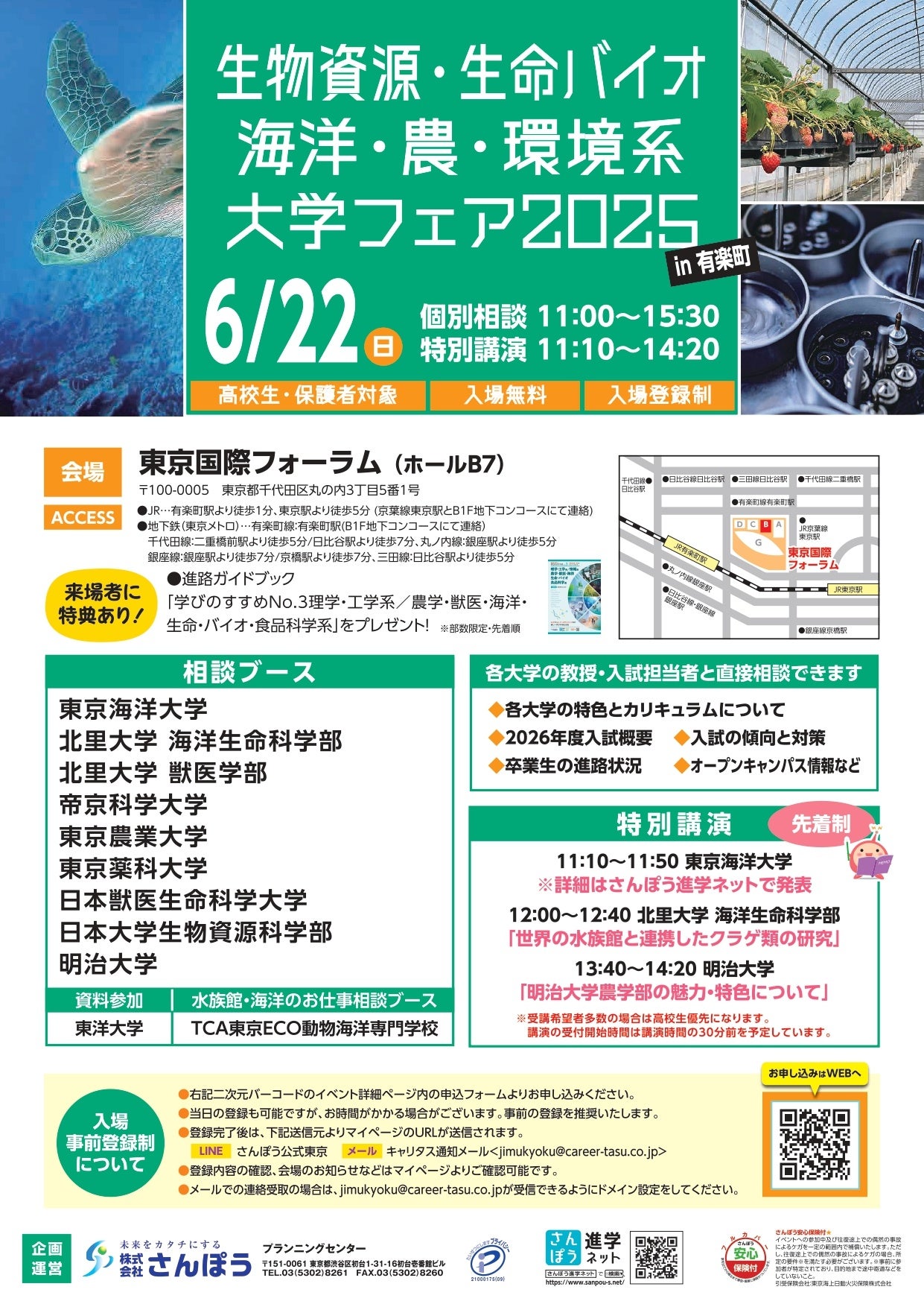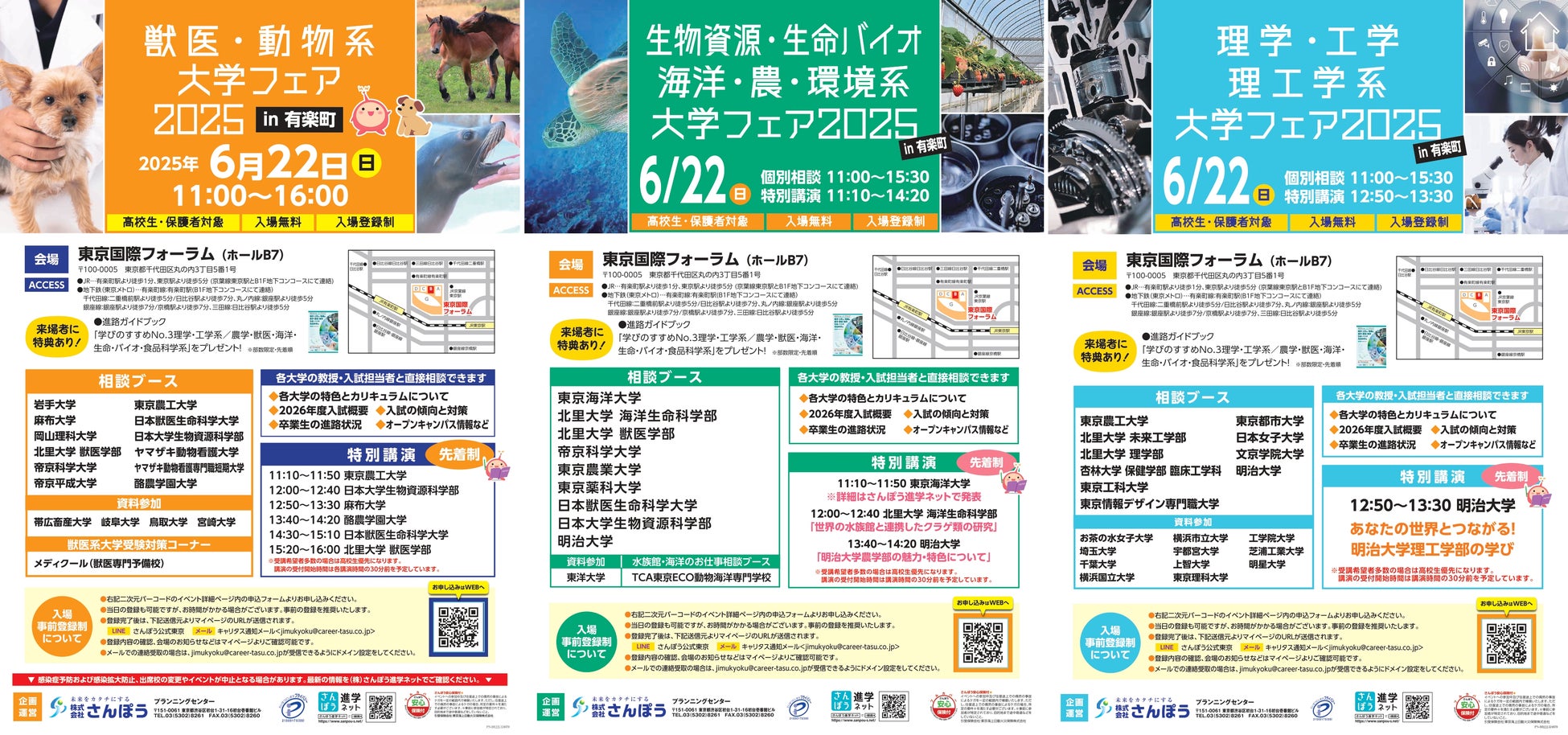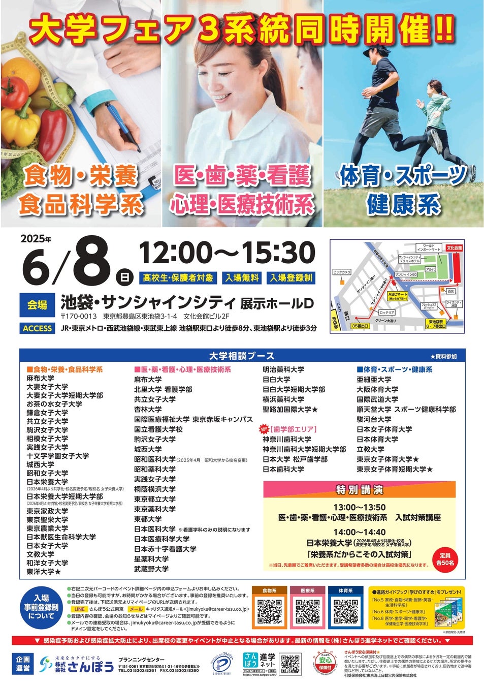 高校生向け進学イベントを手掛ける株式会社さんぽう(本社:東京都渋谷区/代表取締役社長:渡邉王雄)は、2025年6月8日(日)と6月22日(日)に池袋のサンシャインシティ、有楽町の東京国際フォーラムにて学部・系統特化型の大学・短期大学進学フェアを開催します。当イベントは、特定の学部・系統を設置の大学・短期大学のみを集めた進路相談会です。学部・系統が同様の大学が同会場にブースを並べているため、一日で多くの大学・短期大学を比較頂けます。