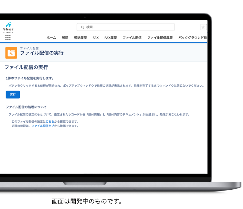 @Tovas for Salesforceでは、SalesforceのデータをPDF出力しWeb配信/郵送/FAX送信までをワンクリックで行うことが可能になります。今までは手作業で行っていた帳票の作成と印刷、郵送手配までの業務を自動化し、業務の効率化とユーザの作業負担の軽減、社外向け帳票送付の時短を実現します。