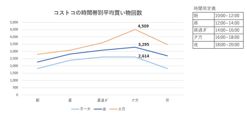 さらに、空いている時間帯を調べるために、コストコでのお買い物を「月~木」「金」「土日」に分け、時間帯ごとのお買い物回数をグラフ化しました。