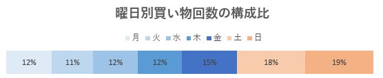 いかがでしょうか、みなさんコストコに行きたくなりましたか?そんなみなさんのために、混雑具合についても購買データから調べてみました。下図はコストコでのお買い物の回数の構成比を曜日ごとに集計したものです。