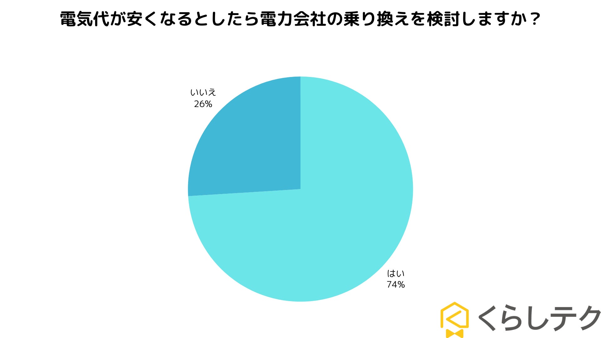 電気代が安くなるなら74.0%の人が電力会社の乗り換えに前向き