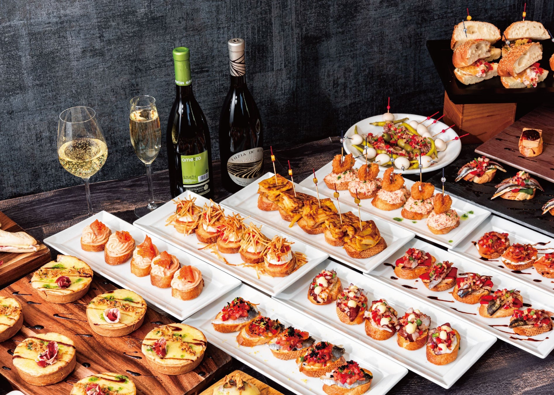 ピンチョスは串(ピンチョ)の意で、もともとは串や楊枝を刺した料理のことを指しますが、現在では串や楊枝は使わずに、海鮮や野菜、シャルキトリーなどをパンの上に乗せていただくスペインバルの伝統的なおつまみを意味します。芸術的な見た目は、味はもちろん目でも楽しめるお料理です。数々の賞を受賞した珠玉のピンチョスと直輸入ワインをお愉しみください。