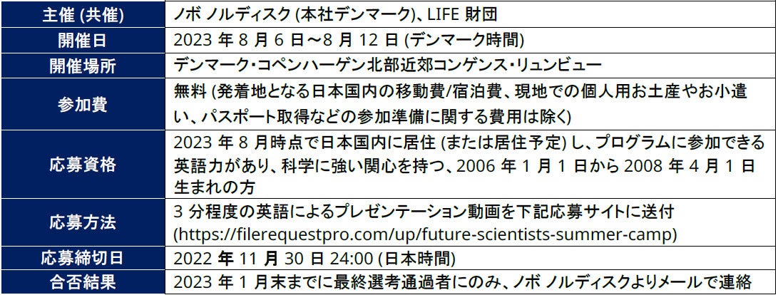 ノボ ノルディスク ファーマ株式会社 (代表取締役社長:キャスパー ブッカ マイルヴァン、本社:東京都千代田区) は、本日、ノボ ノルディスク (デンマーク本社) が2023年にデンマークLIFE財団と合同でデンマークにて開催する、未来の科学者を目指す若者たちを集めた「フューチャーサイエンティストサマーキャンプ」への日本からの参加者の募集を開始したことをお知らせいたします。