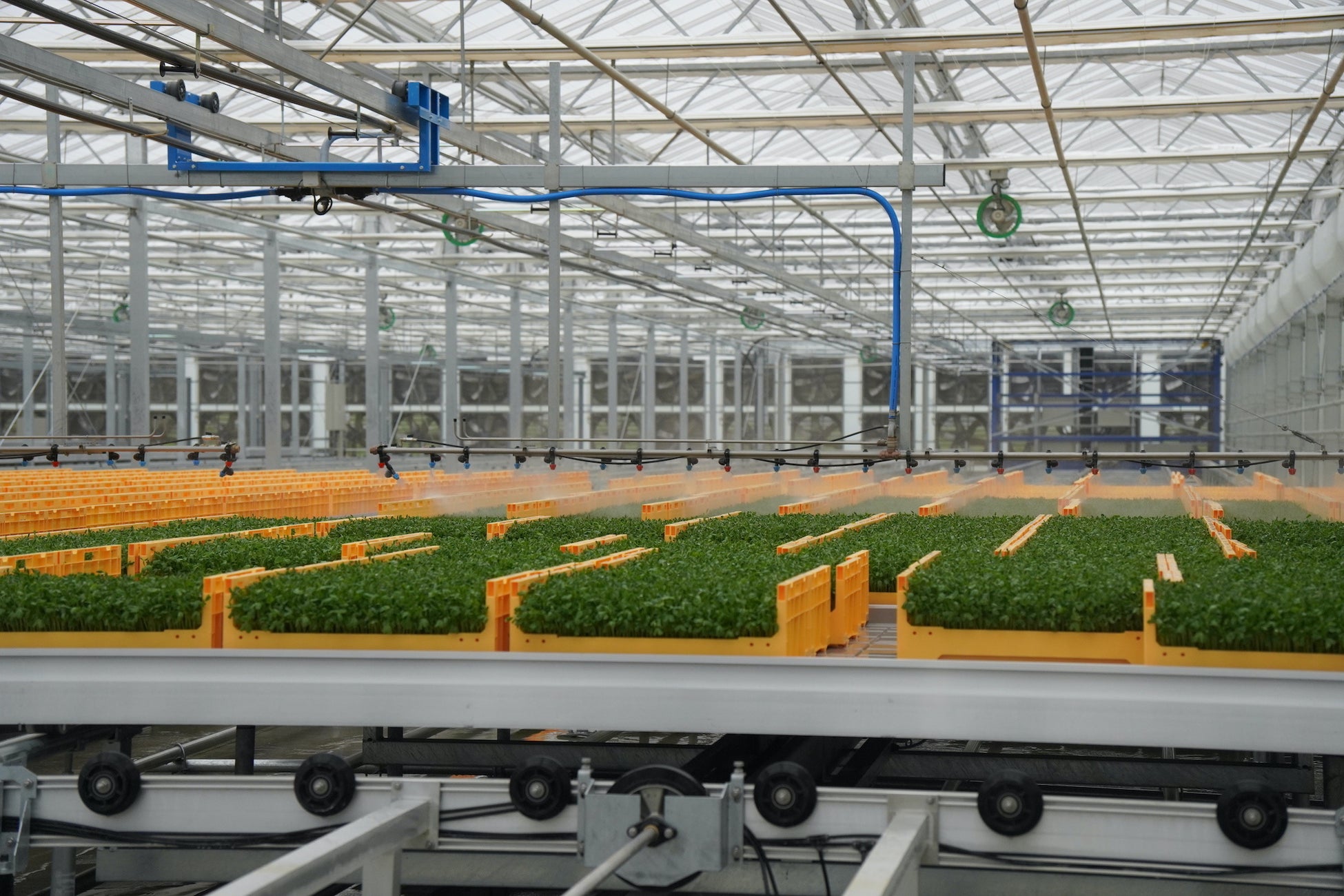 同システムとしては純国産第一号。栽培容器を載せたベンチを、コンピュータ制御で 播種場〜緑化場〜予冷庫 まで移動させ、搬送作業の自動化を実現しました。中央制御室から一括制御可能な最新システムを採用しています。