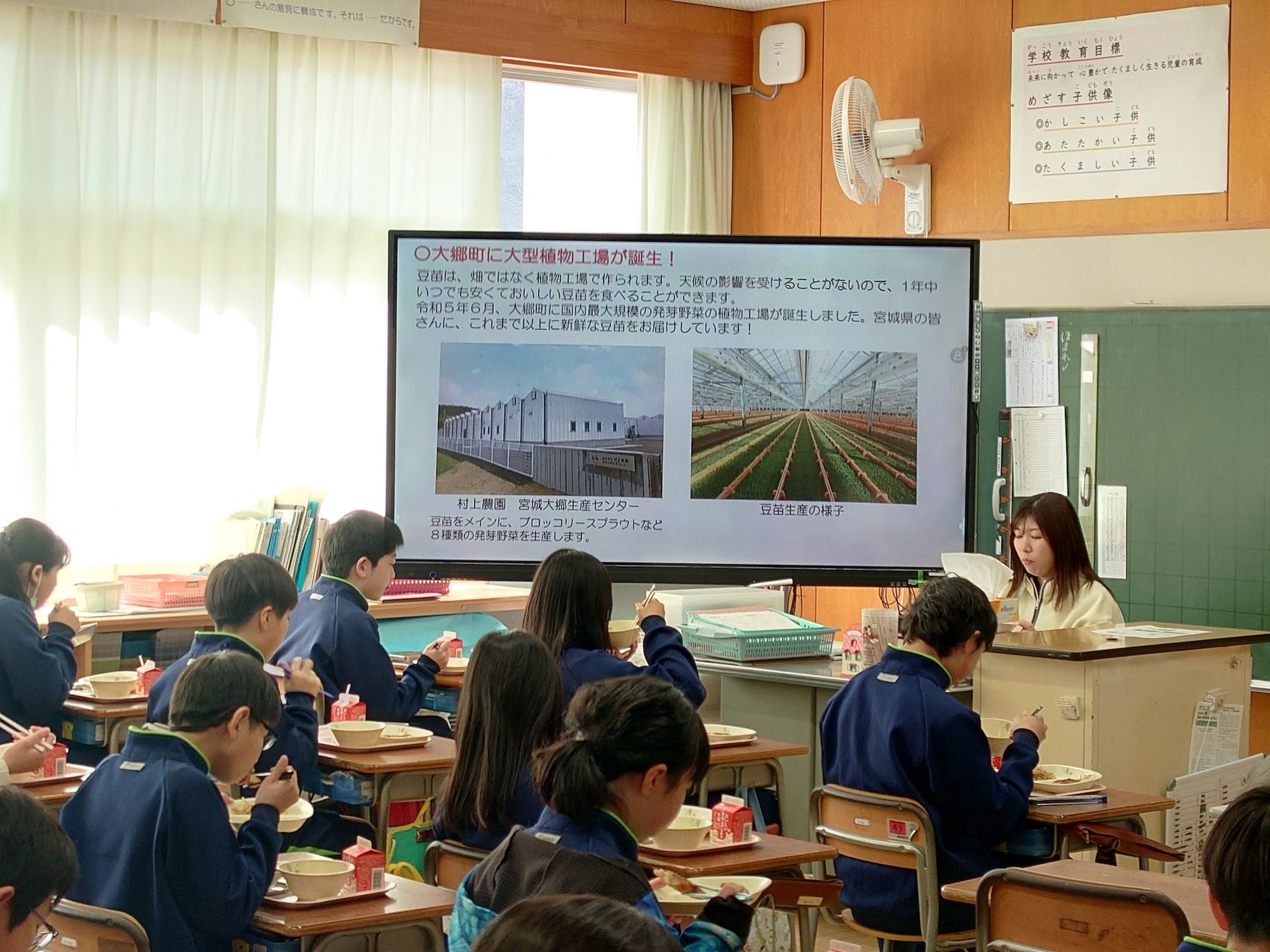 発芽野菜の生産・販売を行う株式会社村上農園(本社:広島市、代表取締役社長:村上清貴、以下 村上農園)は、2023年6月、宮城県大郷町に東北エリア初となる生産センター「宮城大郷生産センター」を新設しました。このたび2024年3月4日(月)、大郷町内の小中学校(大郷小学校、大郷中学校)の給食に同センターで生産した発芽野菜「豆苗(とうみょう)」が初めて登場しました。