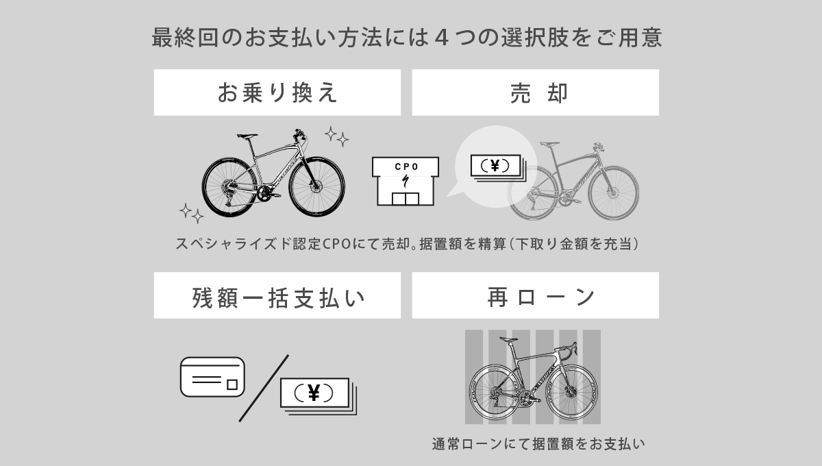 スペシャライズド残価据置型ローンは、車体の現金価格から一部を据え置き、残りを24回(もしくは36回)で分割し、25回目(もしくは37回目)の最終回に据置額を精算します。据置額は価格の40%を上限に1,000円から任意に設定可能で、実質年率は2.9%。最終回の支払いの際に、乗り換え・売却・一括支払い・再ローンのいずれかを選択し、据置分を精算します。