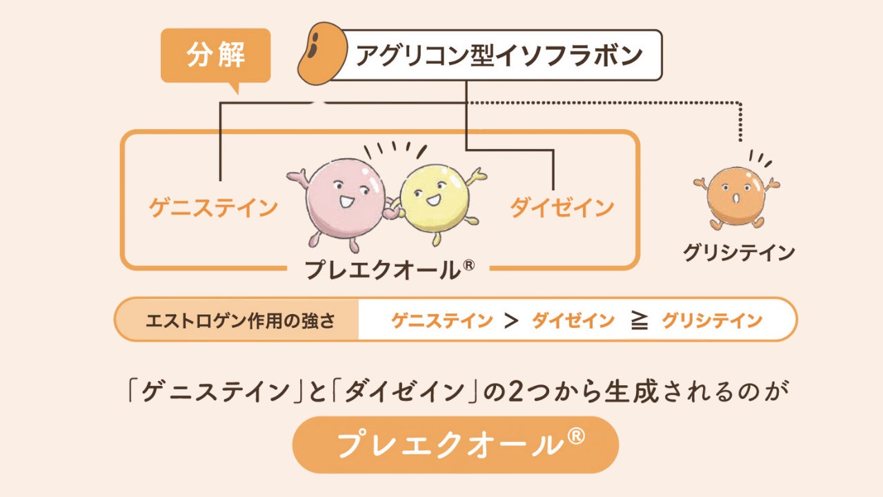 大豆イソフラボンを摂取すると体内でエクオールという成分を生み出し、ゆらぎを感じる女性を内側からサポート。大豆イソフラボンは、グリコシド型とアグリコン型の2種類分かれ、エクオーラビューティーは、グリコシド型よりも分子量が小さく、体への吸収力が優れたアグリコン型を使用しています。