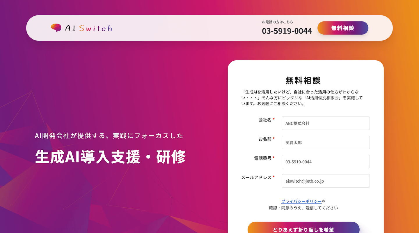 生成AI研修・コンサルティング『AI Switch』: 実務に直結するAIスキルを短期間で習得できる研修プログラムで、企業や個人のリスキリングを後押し
