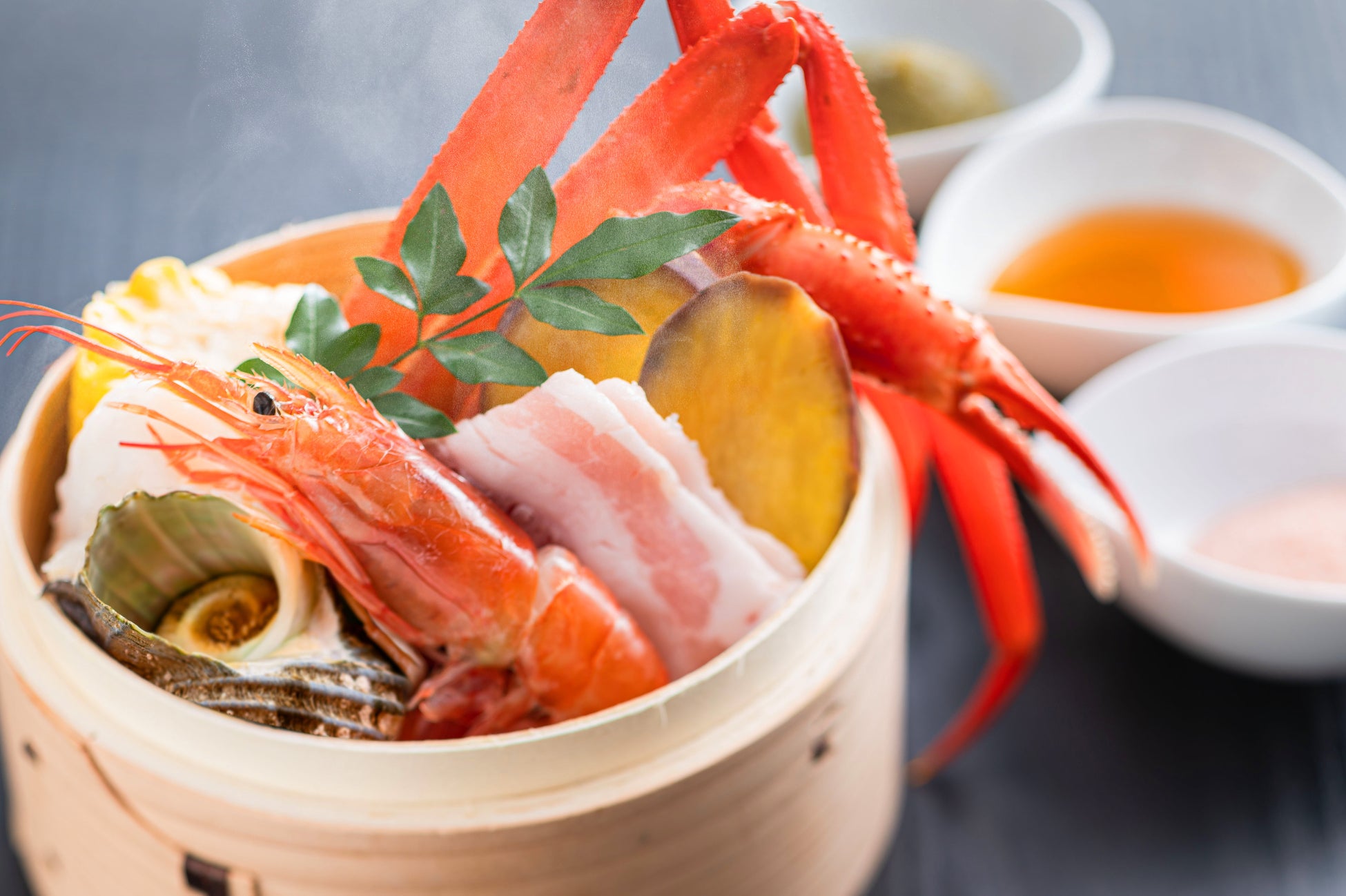 お食事は、今まで提供していた会席料理から大幅にリニューアルし、種類豊富な料理をお楽しみいただけるプレミアムバイキング形式に変更。トリュフソースを添えた自家製ローストビーフに温泉せいろ蒸し、ご当地グルメである甘海老塩ラーメンや北陸産鶏の炭火焼などをご堪能いただけます。