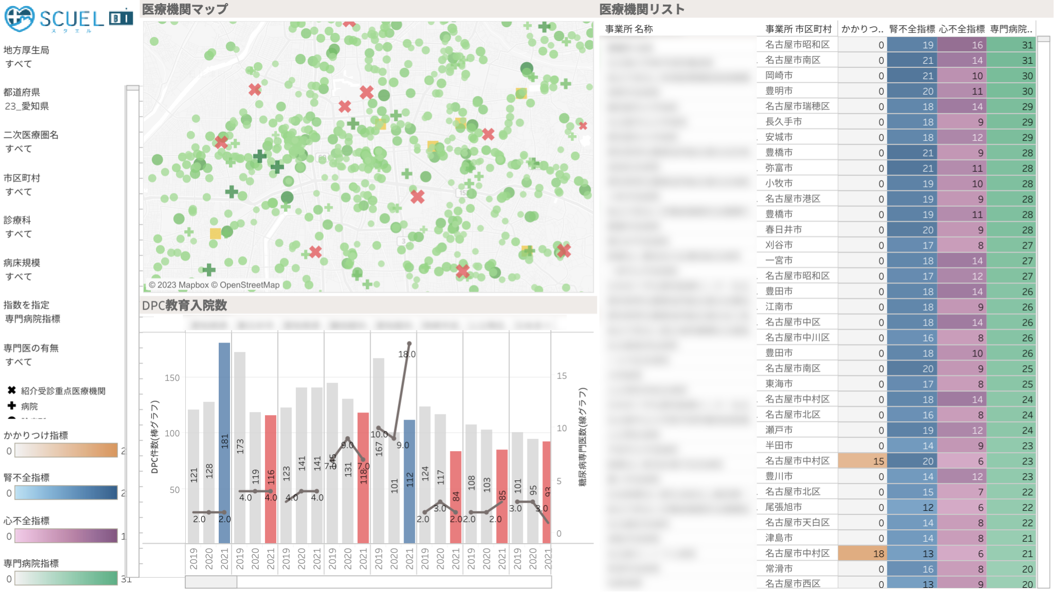 こうした背景を踏まえ、当社はSCUELデータベースを活用した糖尿病地域分析ツールをリリースしました。標榜科、専門医数、施設基準、その他の対応可能な医療機能などの情報をもとに、糖尿病治療に強みを持っている医療機関を把握することが可能です。