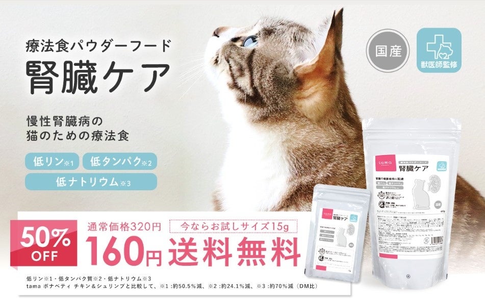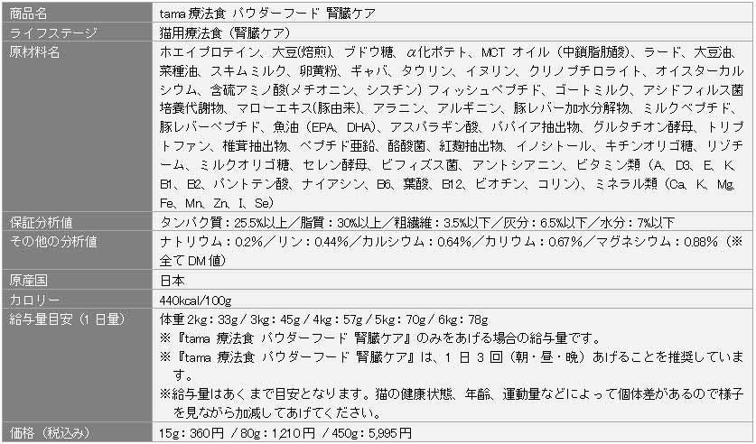 - 新商品『tama 療法食 パウダーフード 腎臓ケア』(15g、80g、450g)
