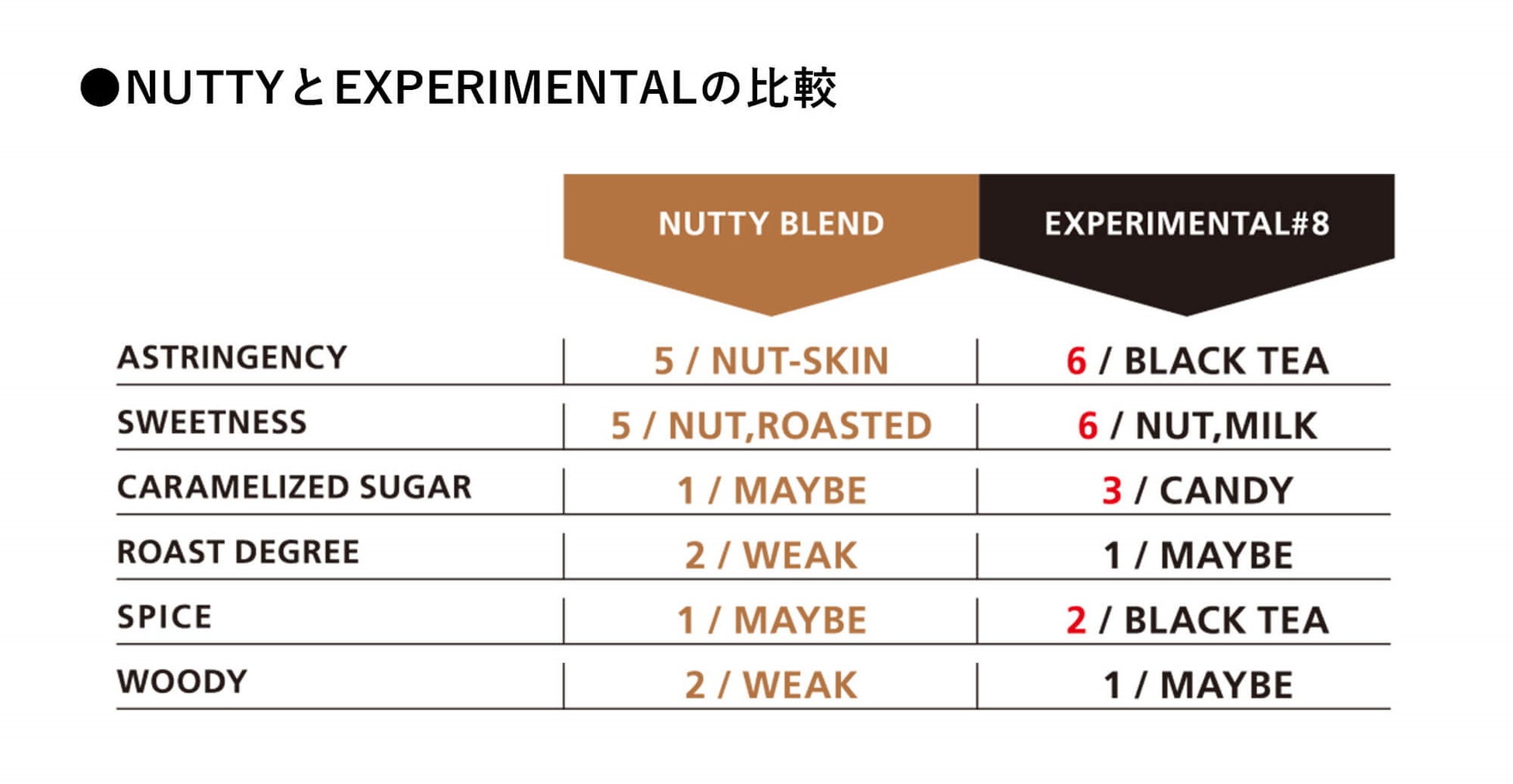 今回の「EXPERIMENTAL #8」では、「NUTTY」のもつ甘味とスパイス香に着目し、甘味の増強と余韻の印象の改善を試みました。