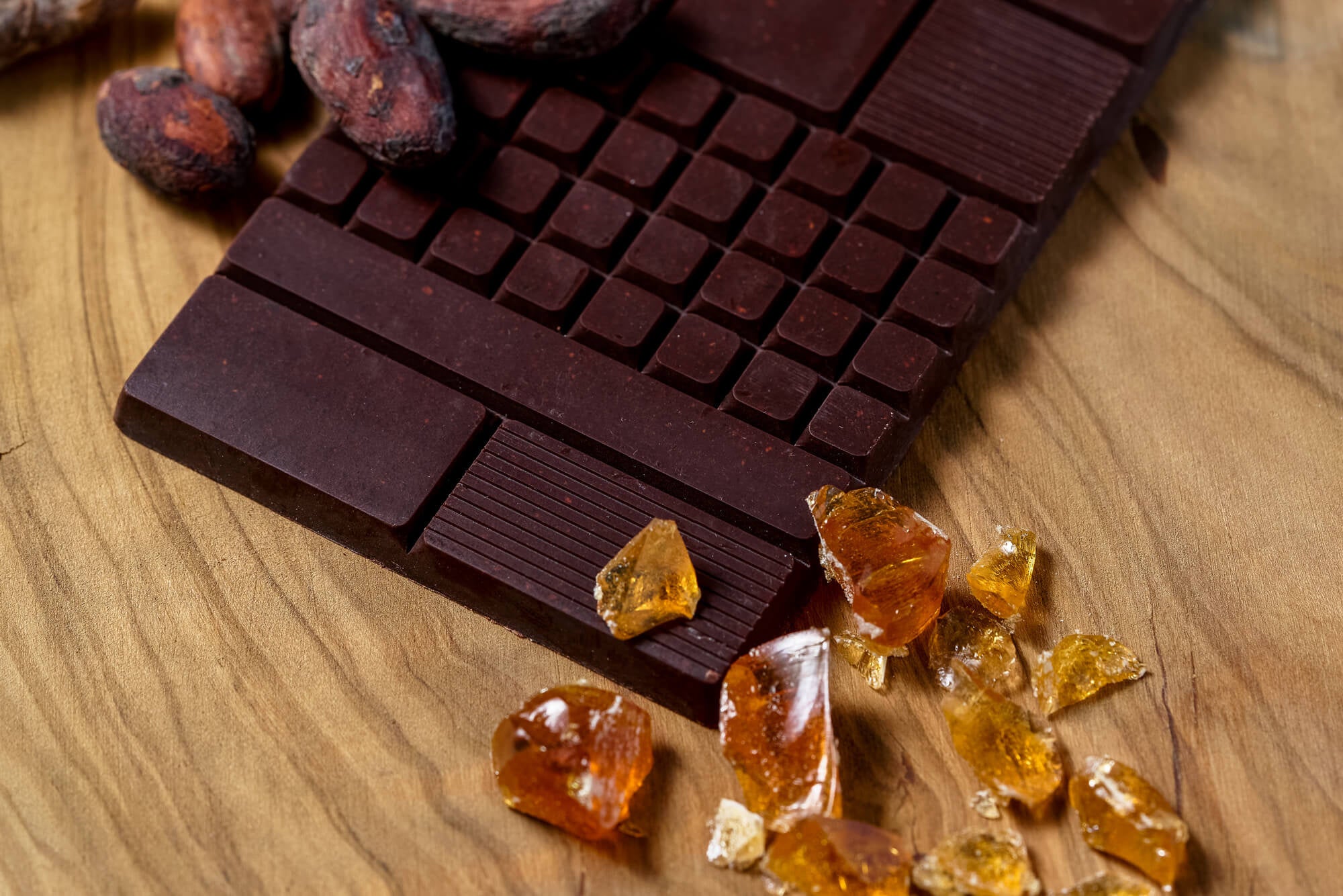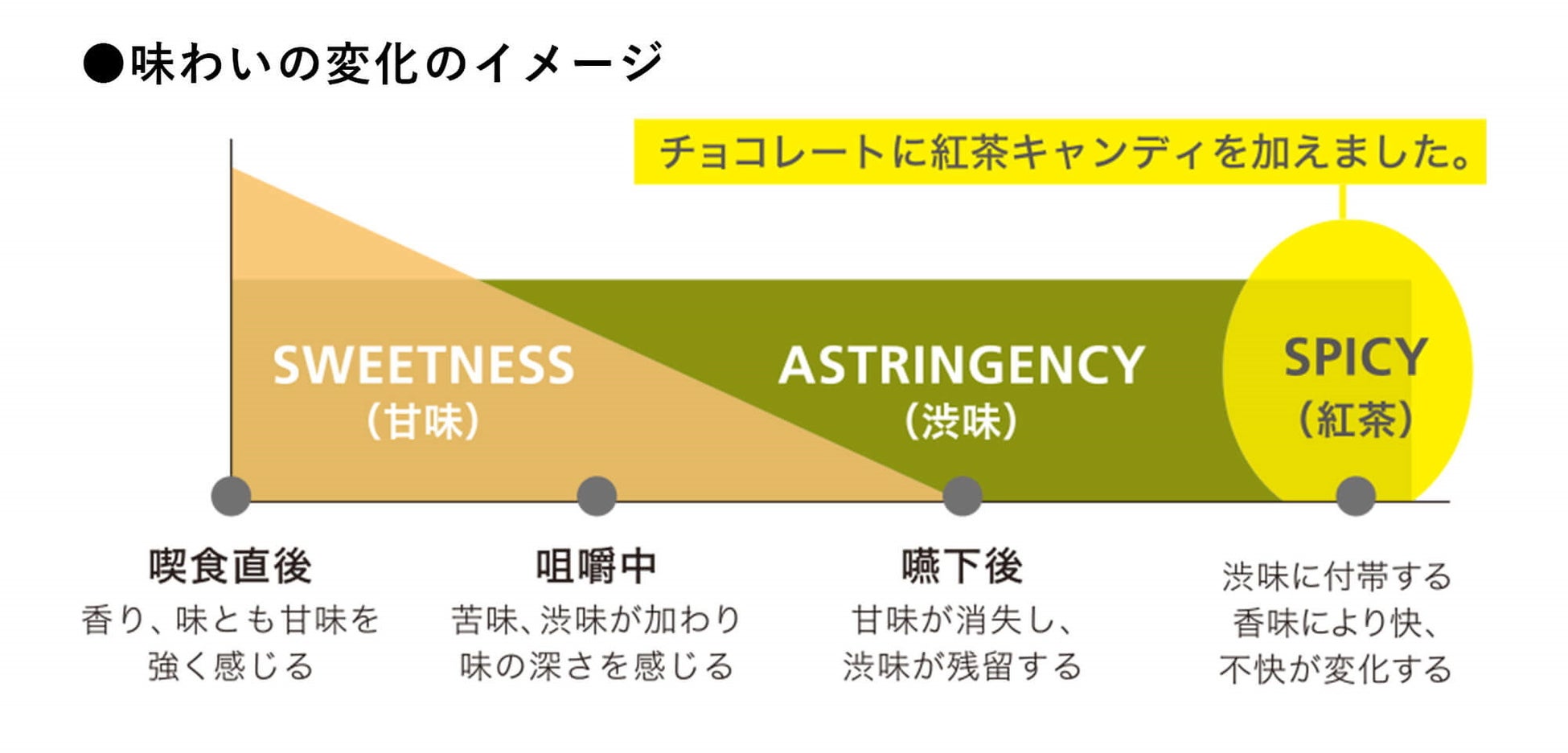 古来からある砕いたキャンディーを入れる製法を参考に紅茶キャンディーを加えることで、カカオ豆だけでは表現が難しい紅茶由来のスパイス感を余韻に感じていただけます。この紅茶由来の余韻によって、後味の印象をより心地良く仕上げました。