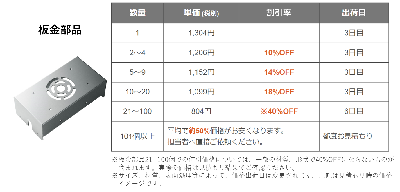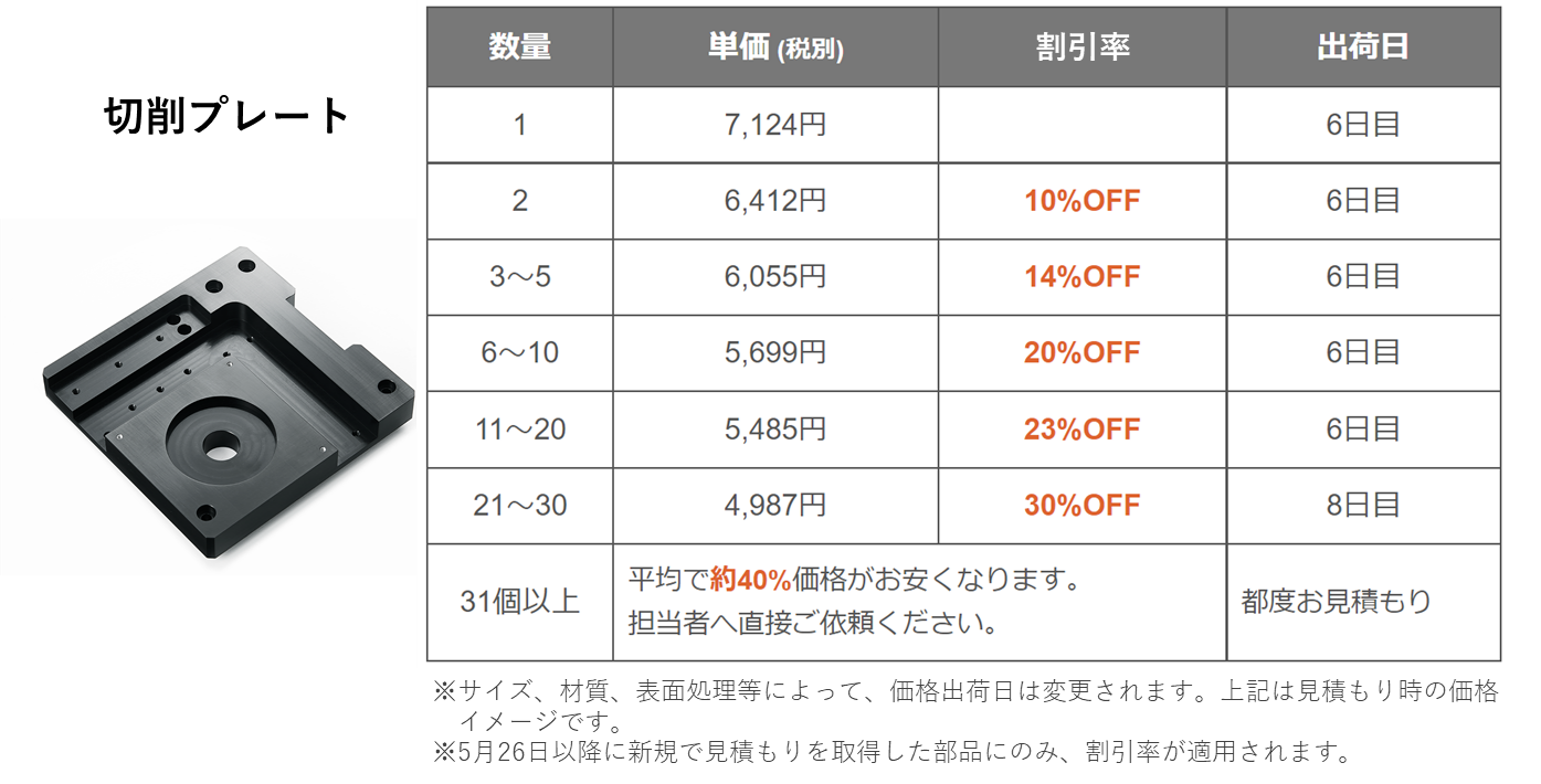 原材料価格の高騰が継続し、当社の主要顧客である自動化産業へますます大きな影響を及ぼしています。当社では新たな生産手法の導入により大幅なコストダウンを実現し、自動化産業を牽引するお客さまへ還元すべく、数量に応じて大幅なプライスダウンとなる新価格体系を適応するに至りました。これにより切削プレートは21個以上で30%OFF、板金部品は40%OFFとなり、より多量のご注文となる場合には個別見積にて切削プレートは平均40%、板金部品は平均50%とさらに割引率が拡大します。