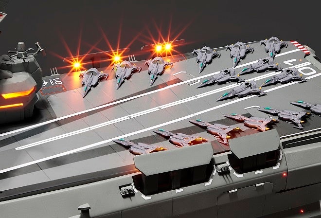 艦載機コスモパイソンやコスモタイガーⅡが甲板に移動するためのエレベーターのギミックも再現。