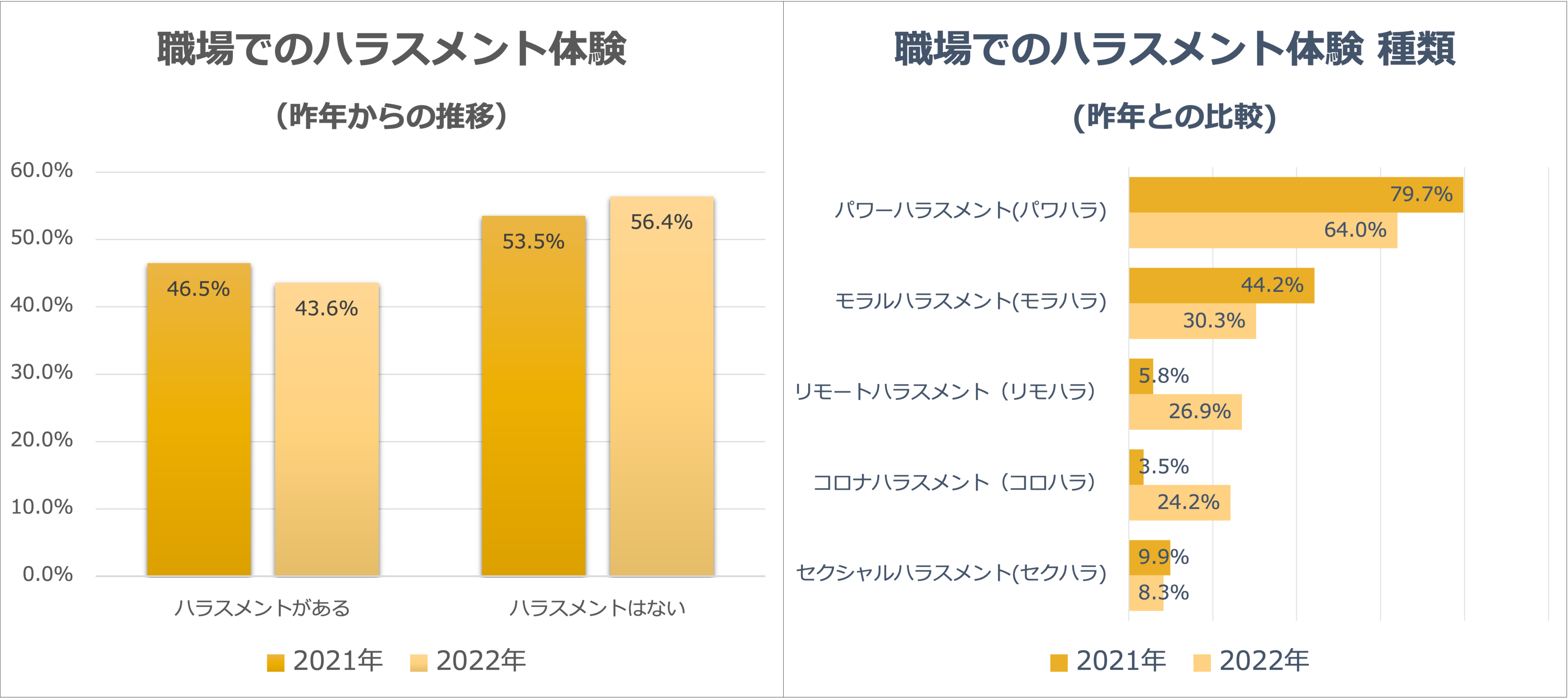 この度実施した「2022年 ハラスメント実態調査」では、昨年実施した同調査との比較もあわせて集計しました。ハラスメント被害について昨年より微減するも、半数以上の回答者がハラスメントがコロナ禍の影響を受けていると回答し、「リモハラ」「コロハラ」が共に昨年調査よりも20ポイント以上増加しました。