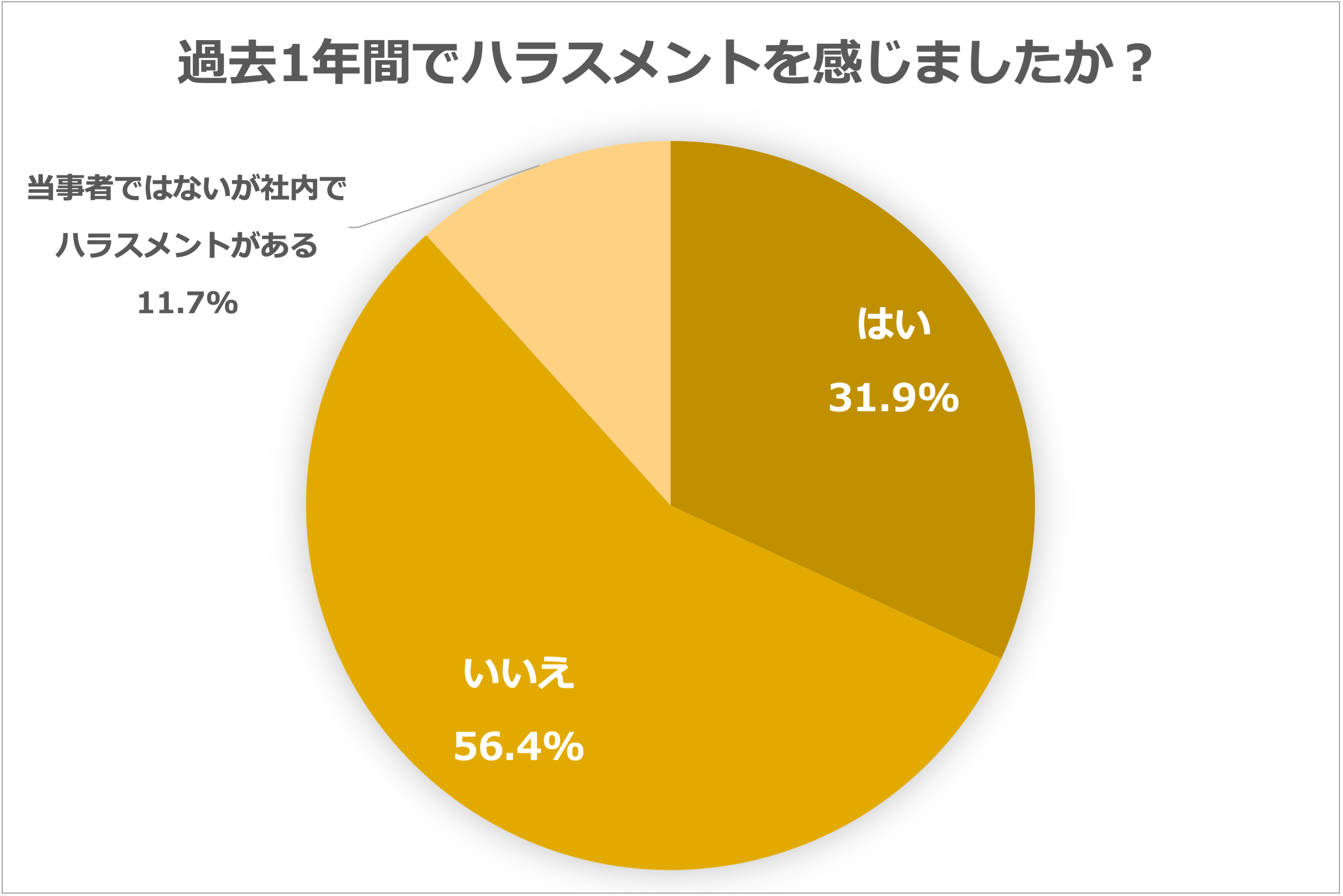 過去1年間でのハラスメントについて、全体の43.6%が何かしらのハラスメントを感じたと回答、その中で「実際にハラスメントの被害を受けた」が31.9%、「当事者ではないが社内でハラスメントがある」と回答したのが11.7%でした。また、昨年と比較すると「ハラスメントを感じた」は微減していて、2021年調査では46.5%に対して2022年は43.6%でした。