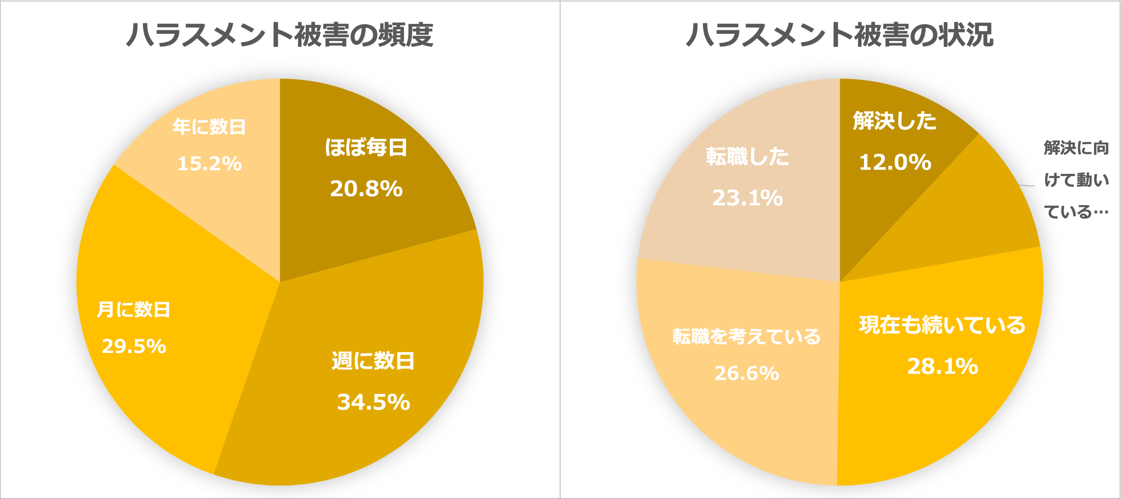 ハラスメントの頻度については「ほぼ毎日」20.8%と「週に数日」34.5%を合算した55.3%が週に数日以上被害を受けている回答結果になり、「月に数日」は29.5%、「年に数日」は15.2%でした。