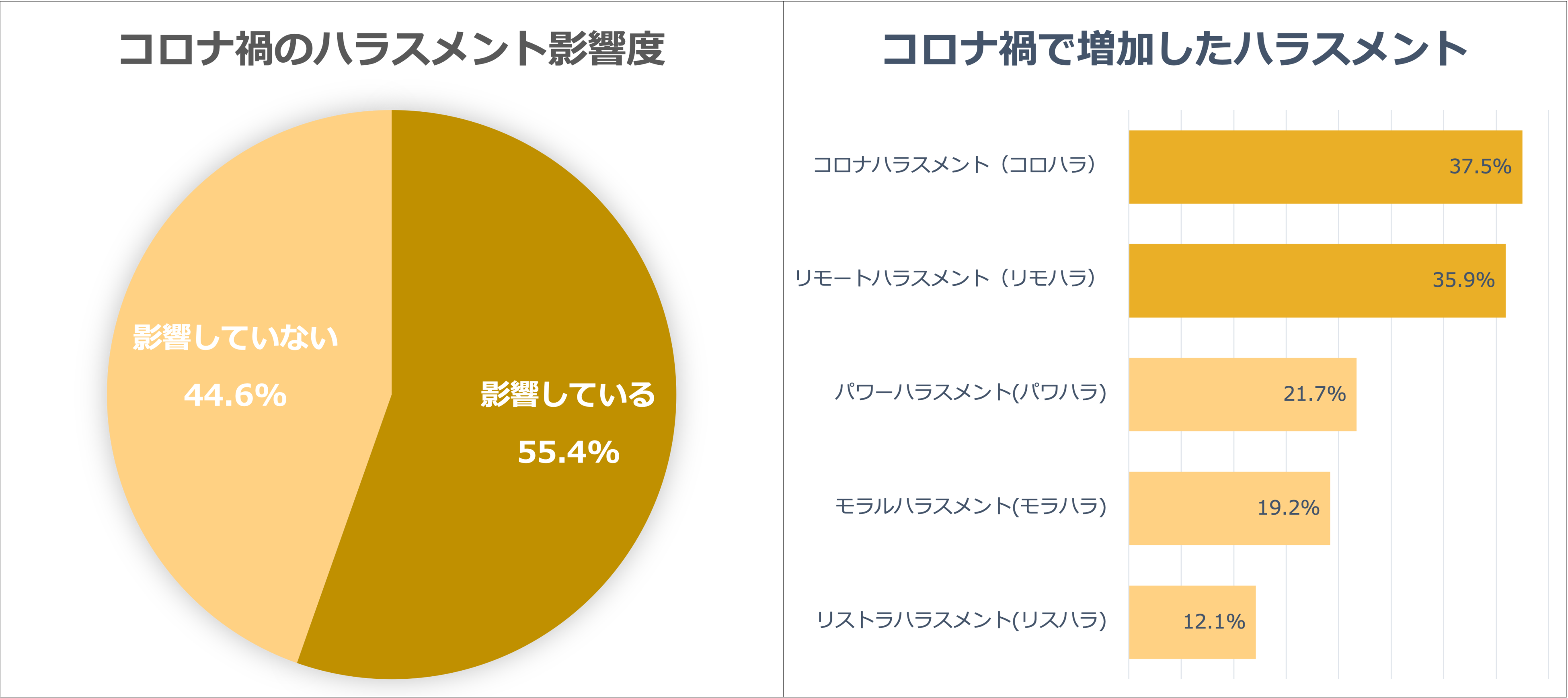 コロナ禍のハラスメント影響度については、55.4%が「影響している」と回答し、コロナ禍が影響して増加したハラスメントについては「コロハラ」が37.5%で最多回答になり、次いで「リモハラ」が35.9%、「パワハラ」が21.7%の回答結果になりました。