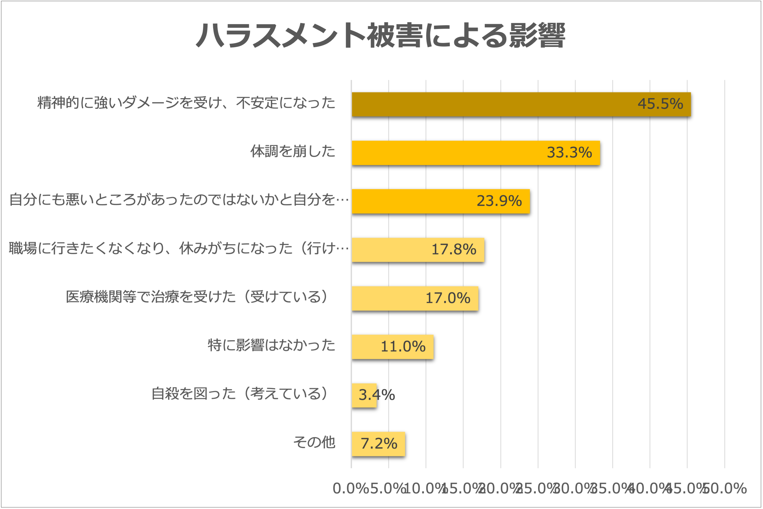 ハラスメント被害による自身への影響では、「精神的に不安定になった」が45.5%で最多回答になり、次いで「体調を崩した」が33.3%、「自分を責めるようになった」が23.9%の回答結果になりました。