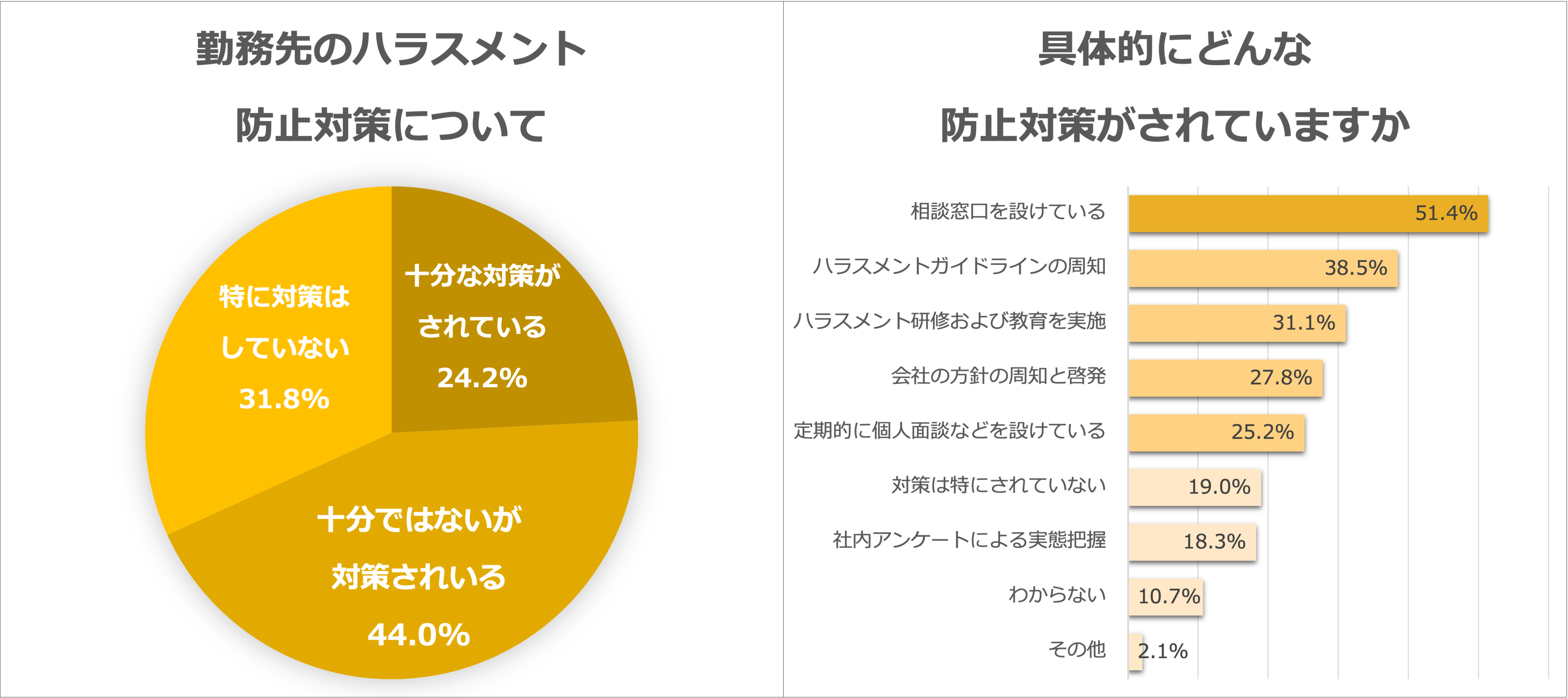 勤務先でのハラスメント防止対策では、「十分な対策がされている」24.2%と「十分ではないが対策がされている」44.0%を合算した68.2%が何かしらの対策がされていると回答し、31.8%が「対策なし」の結果になりました。