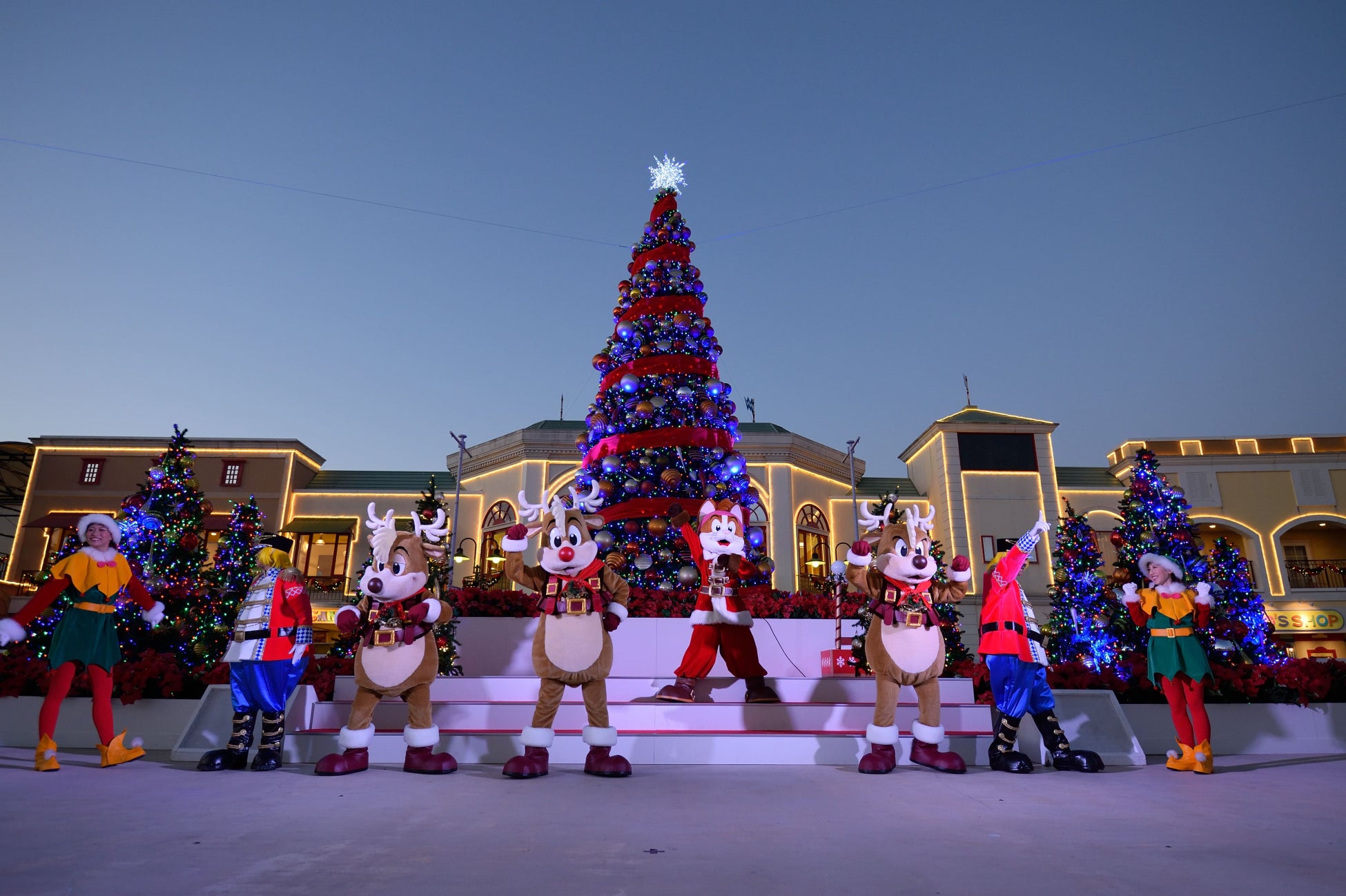 「ジョイアマーレの浜辺」にカラフルに輝くクリスマスツリーが登場。クリスマスツリーを舞台に行われる点灯式で園内のイルミネーションが一斉に点灯します。